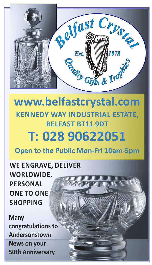 Congratulations to the Andersonstown News celebrating 50 years in 2022. Belfast Crystal ourselves celebrate 44 years in business this year and are delighted to have worked with the Andersonstown News for many of those years.