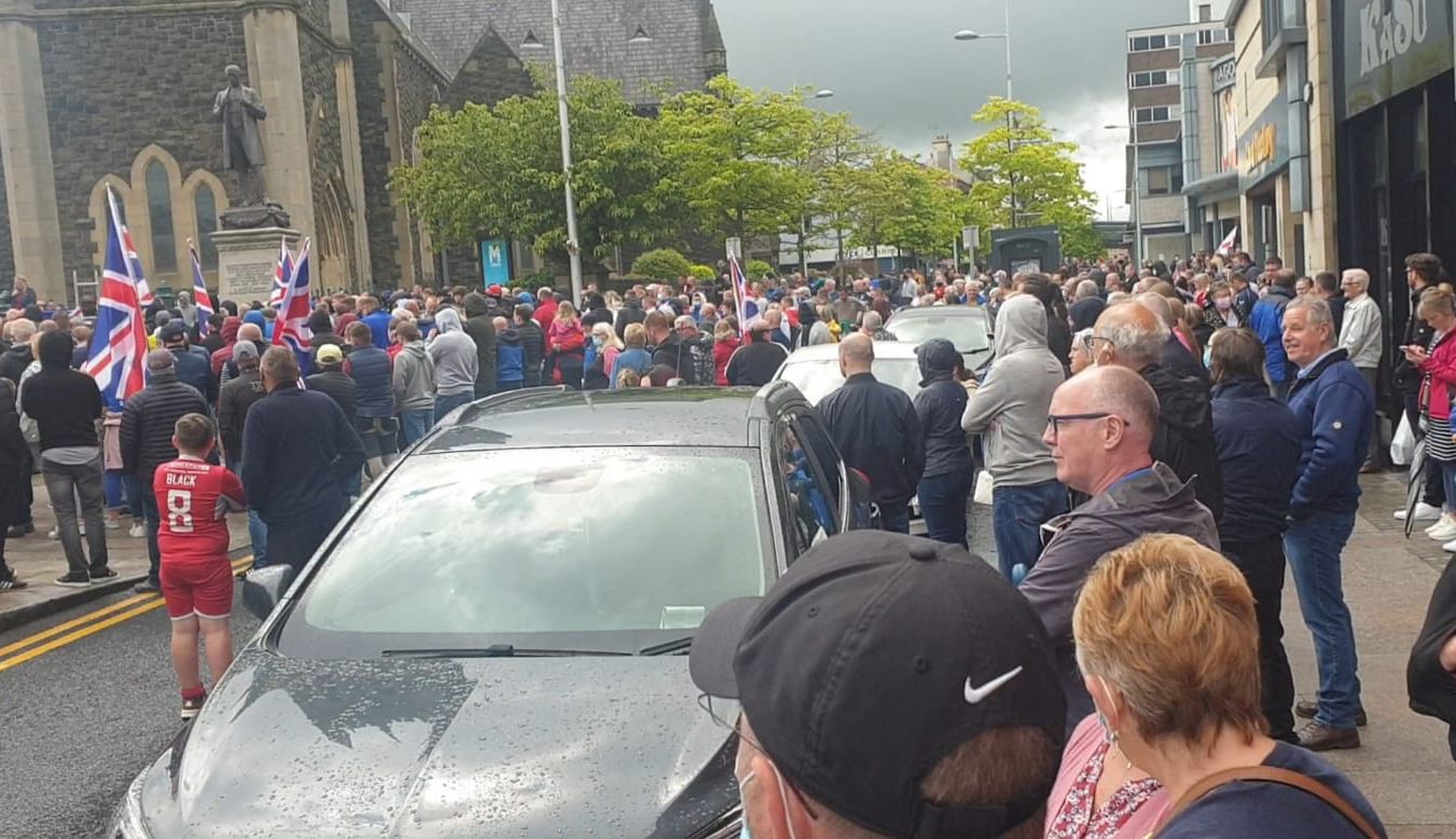 The protest was an illegal one not just because the Parades Commission hadn’t been informed about it, but because it broke the new Covid regulations which say that no more than 500 people are allowed to attend outdoor gatherings. The parade which kicked off the event by making its way through light rain to the rally point was 300-strong. Squinter would estimate the waiting crowd underneath the church clock as between 600 and 800 – that crowd being swollen, of course, to around or over the 1,000 mark by the arrival of the parade participants.