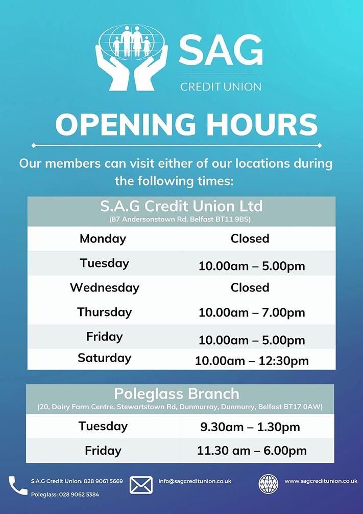 SAG Credit Union Limited will be able to manage better the regulatory requirements of both offices, with the main objective of enhancing service provision and will continue to lead the way in the provision of loans, savings and budgeting services with accessible, friendly, financial services in the Greater Andersonstown and Poleglass area.