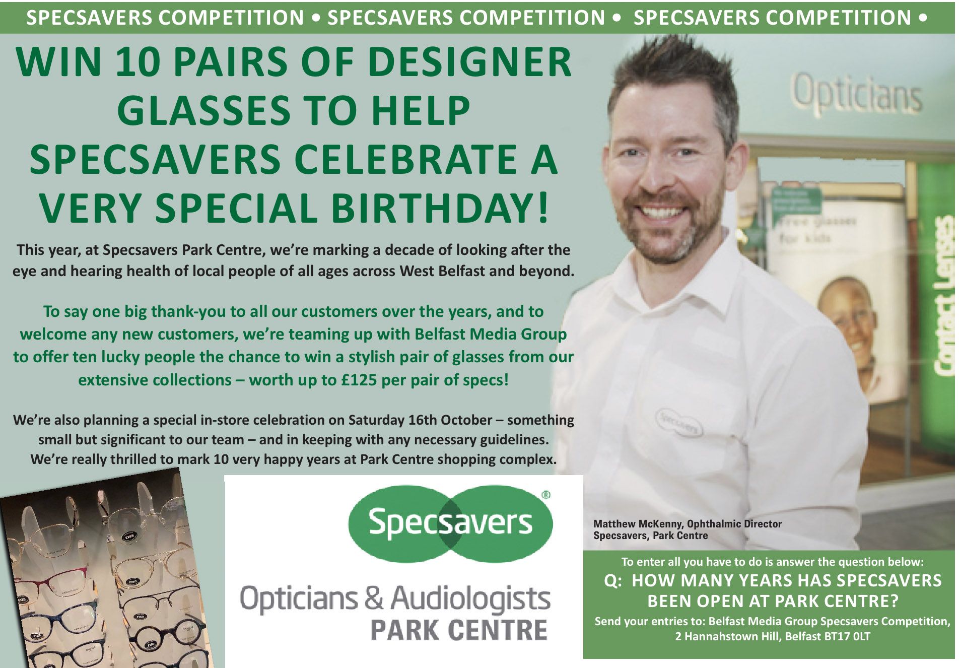 Specsavers in the Park Centre will officially celebrate ten years in business in the popular shopping centre on October 16. From small beginnings and staff numbers, the store has grown significantly over the past ten years and provides a range of services from expert eye tests, eye health and hearing.