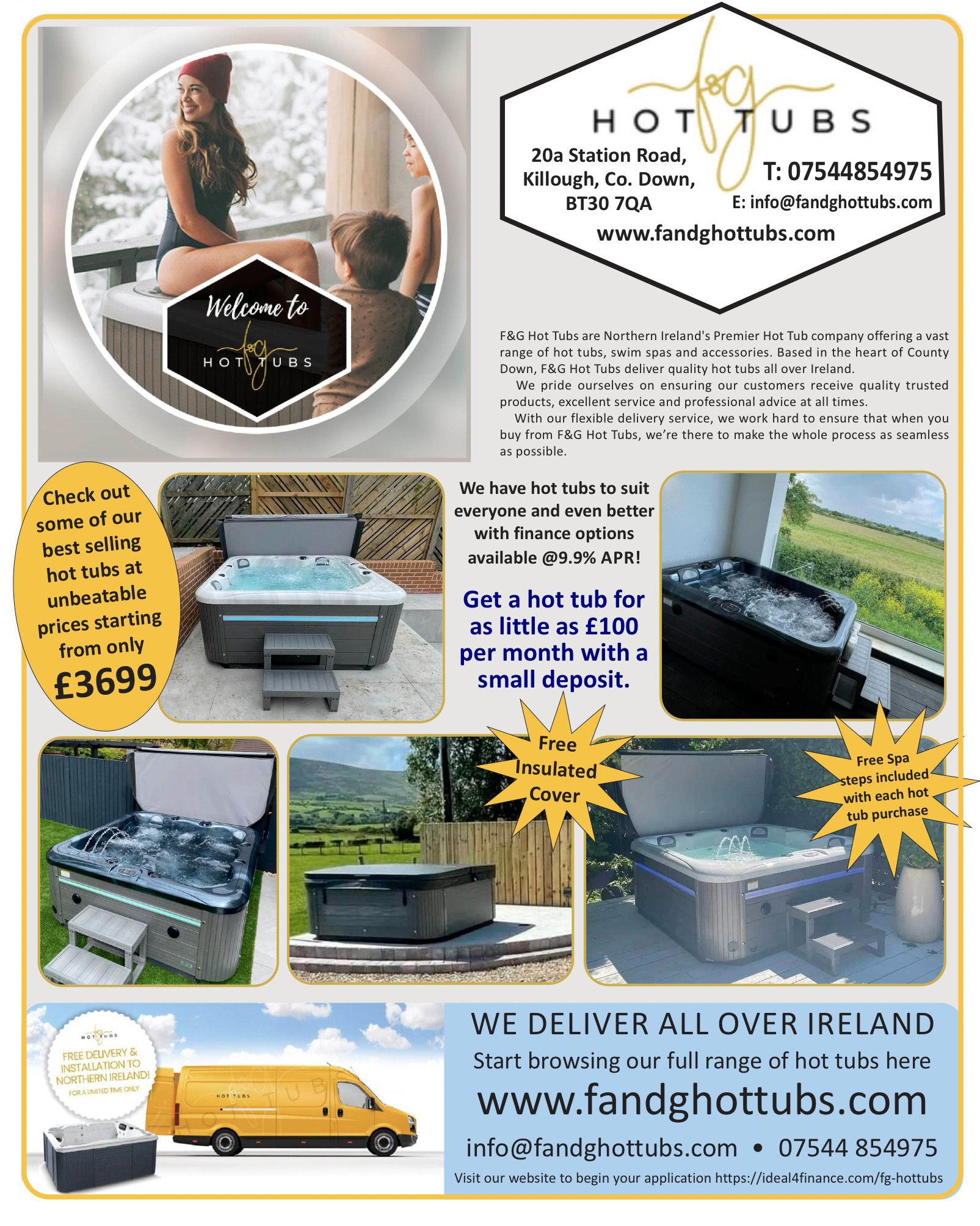 F&G Hot Tubs are Northern Ireland's Premier Hot Tub company offering a vast range of hot tubs, swim spas and accessories. Based in the heart of County Down, F&G Hot Tubs deliver quality hot tubs all over Ireland.
