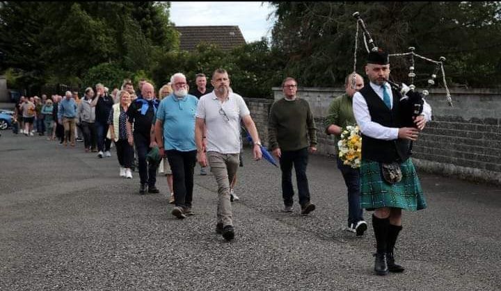 After walking from the clubhouse to the Andersonstown Road, Chairman Alan Daly welcomed those in attendance and called on piper Shane O'Neill to play a lament while Joe Compston lowered the national flag.