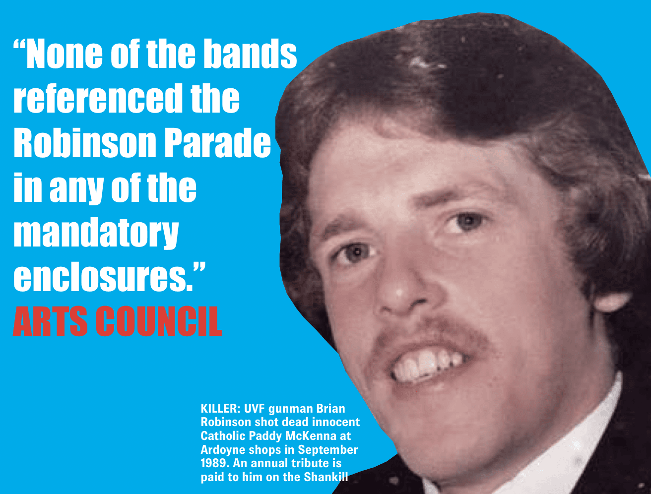 The Brian Robinson parade is a large-scale tribute to a UVF killer who in September 1989 shot dead an innocent Catholic, 43-year-old Patrick McKenna, at Ardoyne shops. While making their escape on a motorbike, Robinson and his driver were ambushed by a two-car SAS unit which forced them off the Crumlin Road. Robinson (27) – the pillion passenger and gunman – was shot dead.