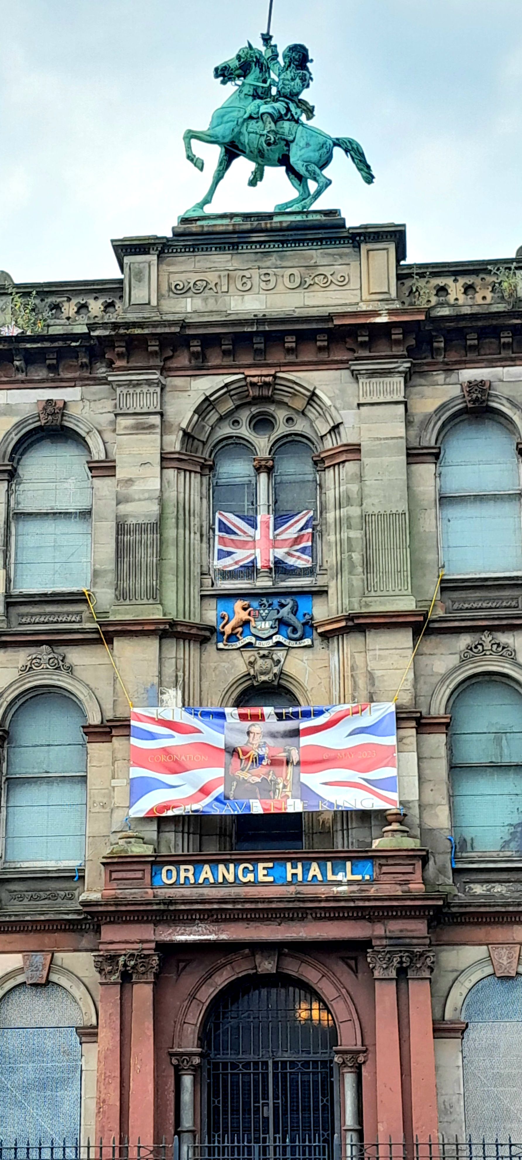 In that same year Belfast saw the unveiling of the ‘bronze sculptured statue of King William III – King Billy – on the rooftop of Clifton Street Orange Hall on 16th November. Established in 1886 it was described by a leading Orangeman as “the finest Orange Hall in Ireland, or it might be in the world, finished and crowned with a magnificent statue…”. At the unveiling a female participant in the crowd was reported as saying of the statue, “The papishes would be cutting their throats when they saw King Billy.”