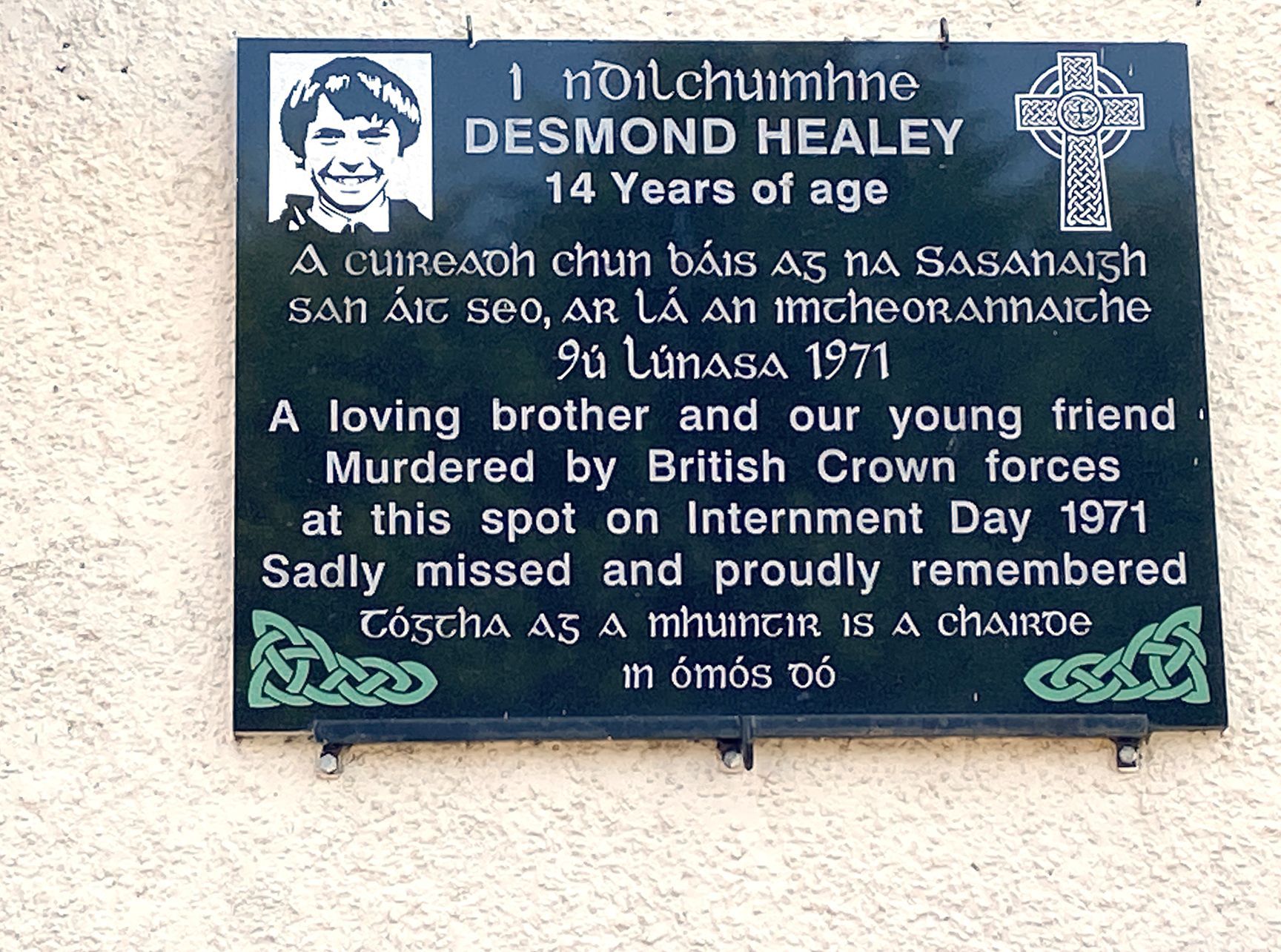 Dessie Healey was shot through the heart by a British soldier during disturbances in Lenadoon following the introduction of internment. The British Army claimed that the teenager had thrown a petrol bomb at the time he was shot dead, however, Coroner Maria Dougan found that he had thrown a glass bottle.