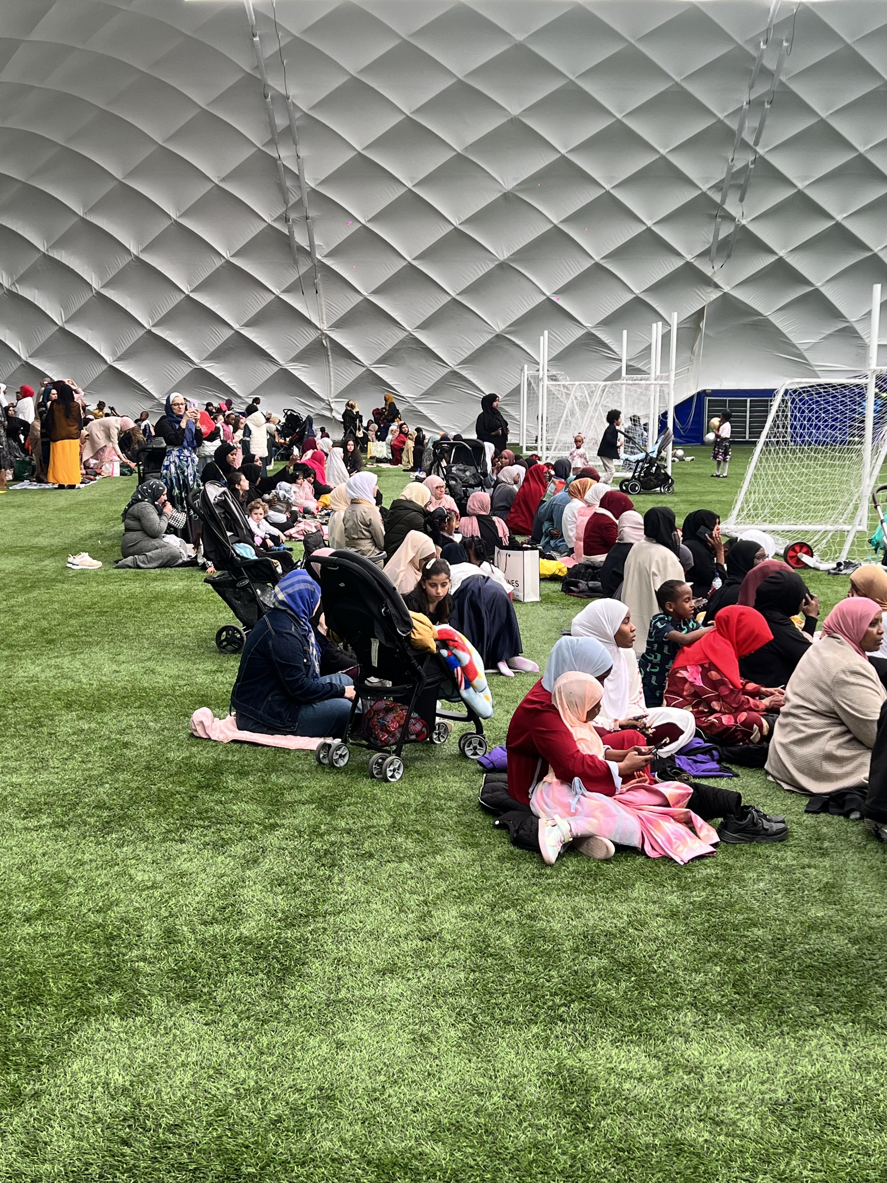 Under the dome at the 3G pitch at Colin Glen Sports on the Black Road in West Belfast, Muslims gathered to mark the Eid al-Fitr holiday.