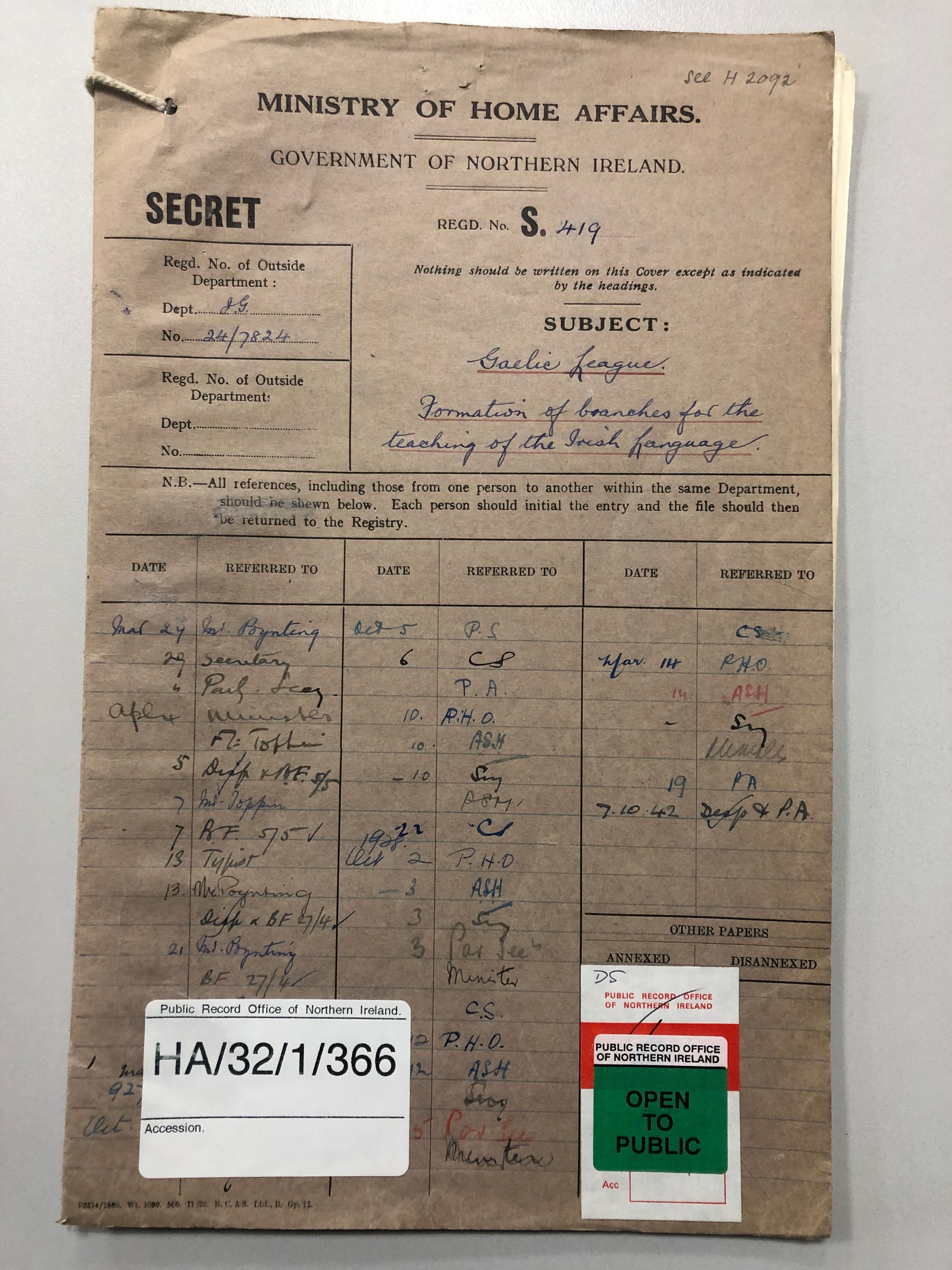 The secret file closes in 1943 with a complaint from the Gaelic League to the Ministry about RUC questioning of its members. This, it argued, was completely unwarranted and unnecessary. The file’s contents, like the Ministry of Home Affairs, is now consigned to history.