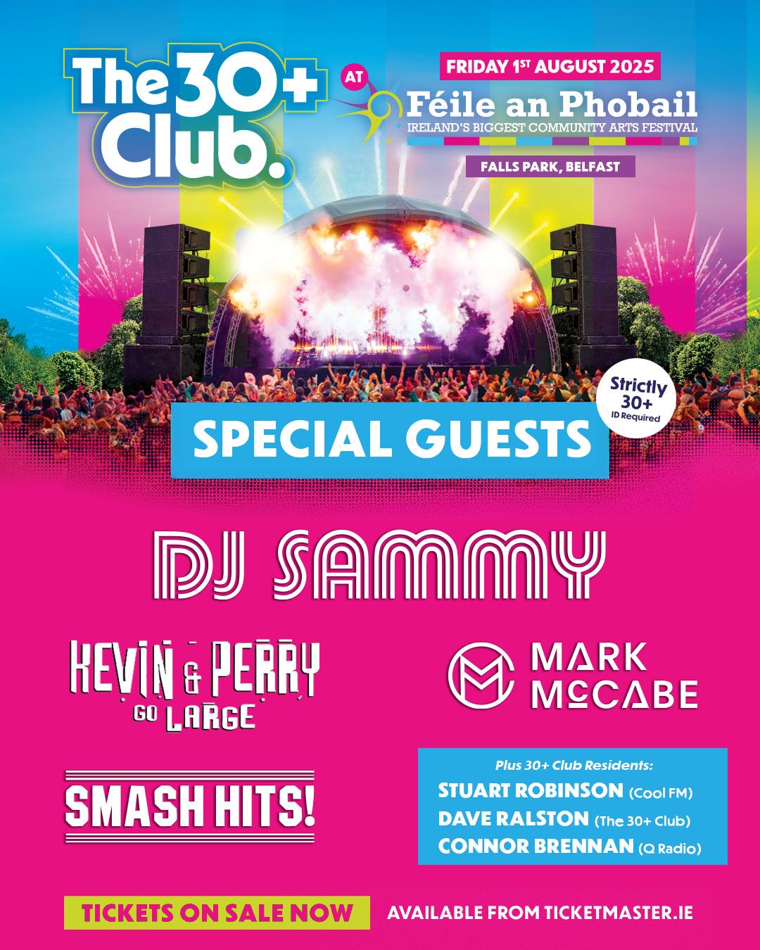 5.30pm-late (Falls Park): 'The 30+ Club' featuring 80's-00's music nostalgia, special guests including DJ Sammy and Mark McCabe and huge giveaways. Tickets are still available from Ticketmaster here.
