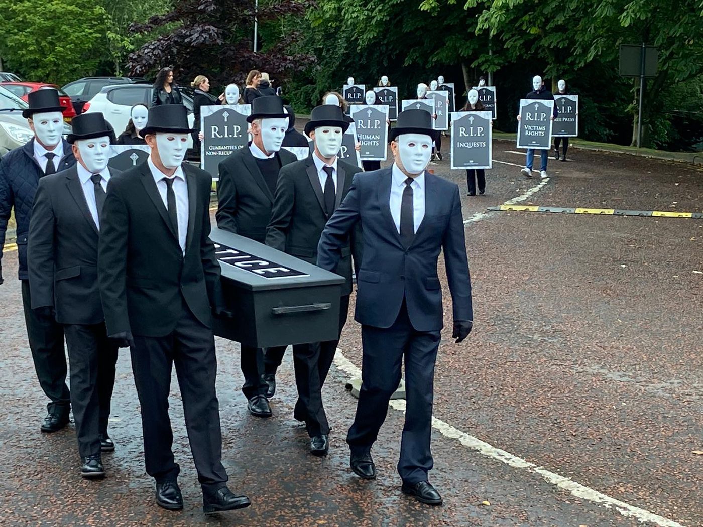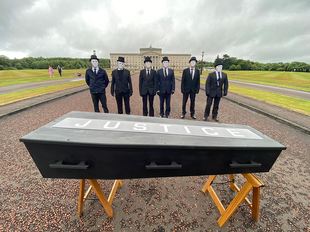 Organised by Relatives for Justice, today's cross-community funerary procession saw masked pall-bearers carry a coffin bearing the word "justice" to Stormont House.