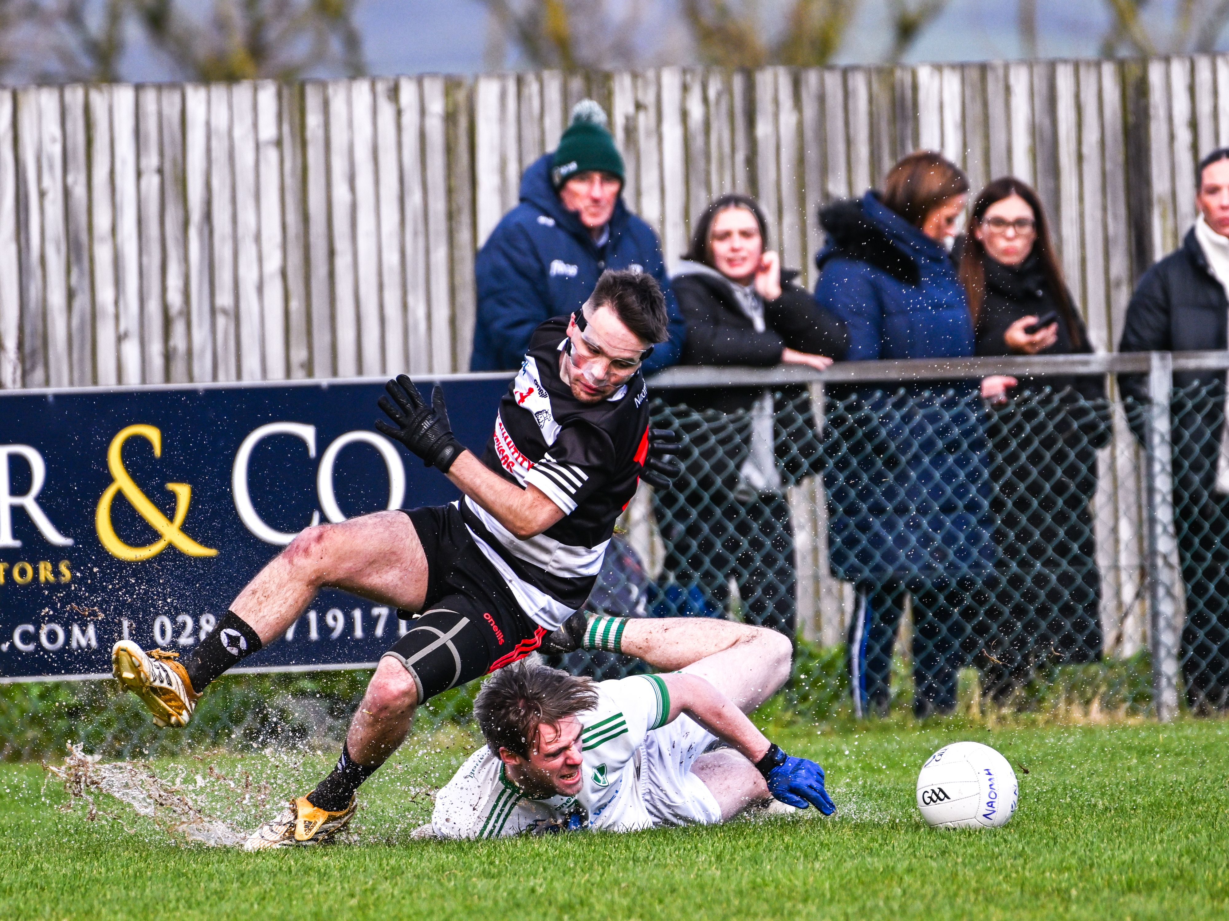 Pre-game favourites St Comgall’s hit the front after Tom Patchett’s free dropped short, Miles Devine gathered and laid the ball to Patrick O’Connor to drop his shot over the bar.