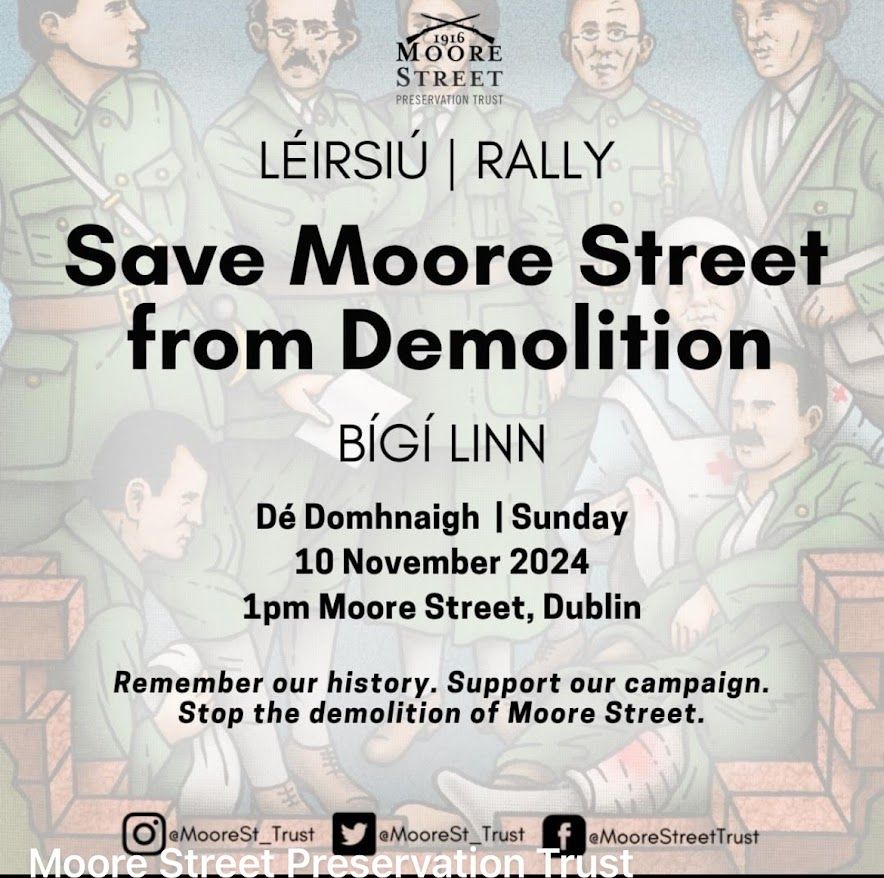 This Sunday the Moore Street Preservation Trust is holding a rally in Moore Street to protest against the decision by An Bord Pleanála. The rally will take place at 1pm and I would encourage all of those who believe that this iconic 1916 historic site should be protected to join with us this Sunday.
