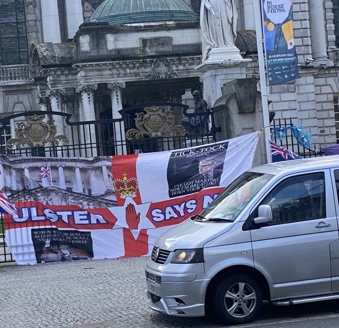 It's believed the banner was erected by 'flag protestors' who have been holding a vigil outside Belfast City Hall since 2013 after the Council voted to limit the flying of the Union flag to only designated days.