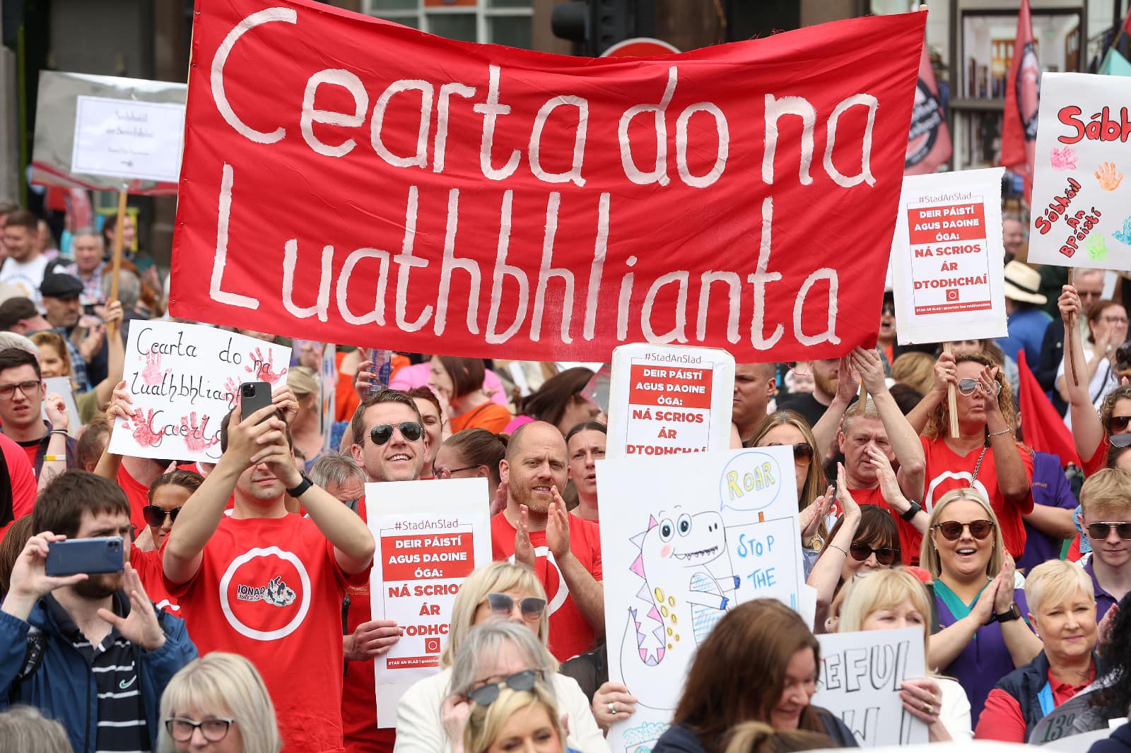 Bhí macalla na manaí ‘sábháil ár seirbhísí’ agus ‘stad den slad’ le cluinstin ag preabadh de bhallaí arda na bhfoirgneamh i lár Bhéal Feirste. Lá stairiúil ab ea é óir bhí an Ghaeilge i lár an aonaigh ar dhóigh nár tharla riamh roimhe. Bhí an gníomhaí Gaeilge Pádraig Ó Tiarnaigh ó Chonradh na Gaeilge agus ón Dream Dearg mar fhear an tí ar an imeacht uilig – samhlaigh! Agus chinntigh sé go raibh an teanga fite sa chur i láthair agus i ngártha an tslua ar dhóigh iontach nádúrtha. Bhí an Deargóir Cuisle Nic Liam, oibríonn leis an Chonradh fosta, ar an ochtar aoichainteoirí a labhair ón ardán fán drochthionchar atá ag ciorruithe le tamall anuas ar a n-earnálacha féin.