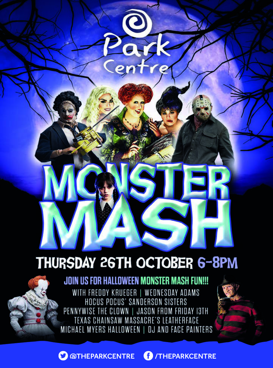 From 6pm to 8pm we have face painters and Halloween characters including Wednesday Adams, the Sanderson sisters from Hocus Pocus, Pennywise the Clown from IT, Freddie Krueger, Leatherface, Jason from Friday 13th, and Michael Myers all in the Park Centre mall along with a DJ playing Halloween tunes.
