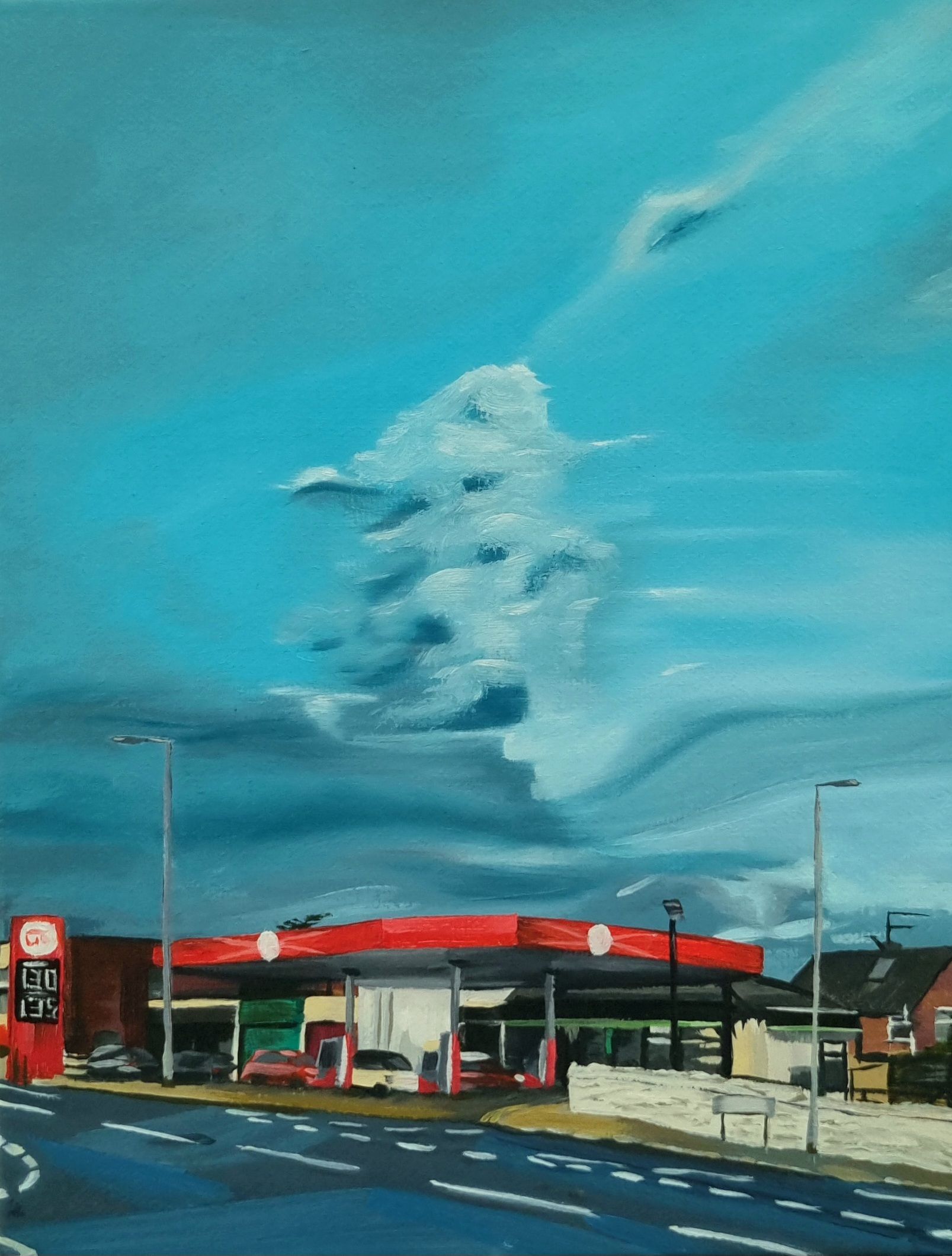 Her chosen painting, Go Garage, depicts the Go Garage petrol station on the Antrim Road, capturing the mounting tension as clouds gather above the forecourt, just before a torrential downpour.