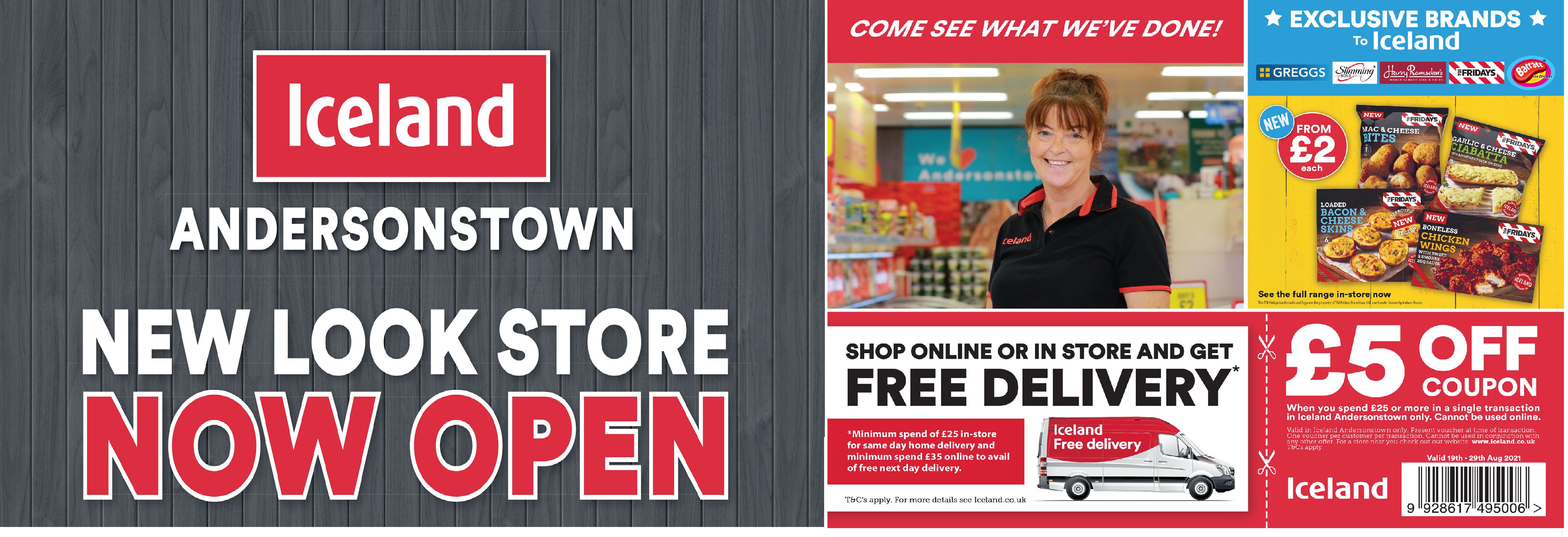 To celebrate the new look store, we’ll have an exclusive £5 OFF Iceland voucher in the Andersonstown News this week.