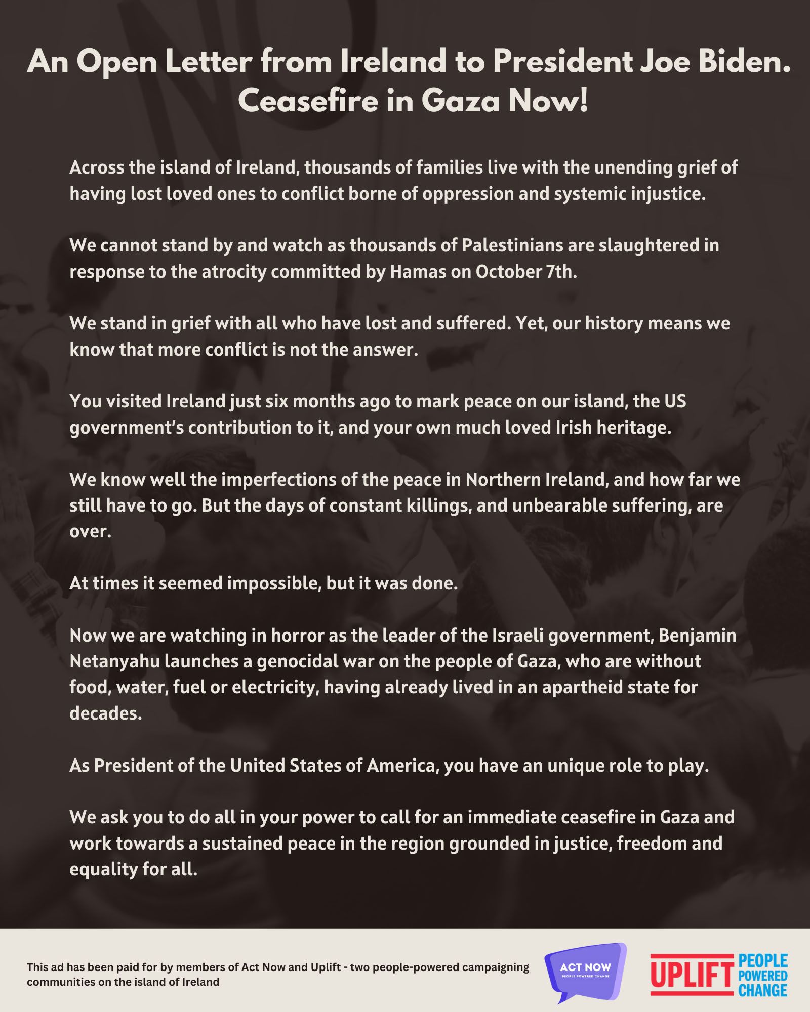 PEOPLE across the island of Ireland have joined forces to publish a full page ad in this week's edition of the Irish Echo, calling on US President Joe Biden to work towards a ceasefire in Gaza.