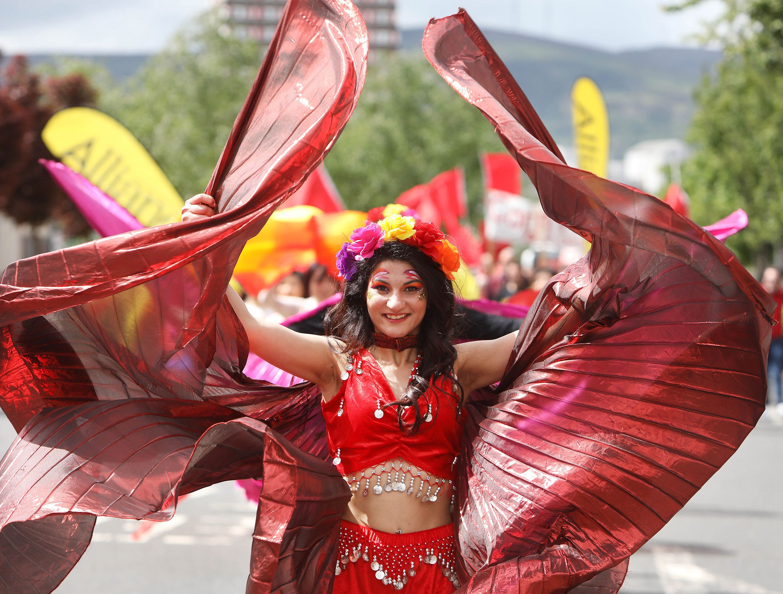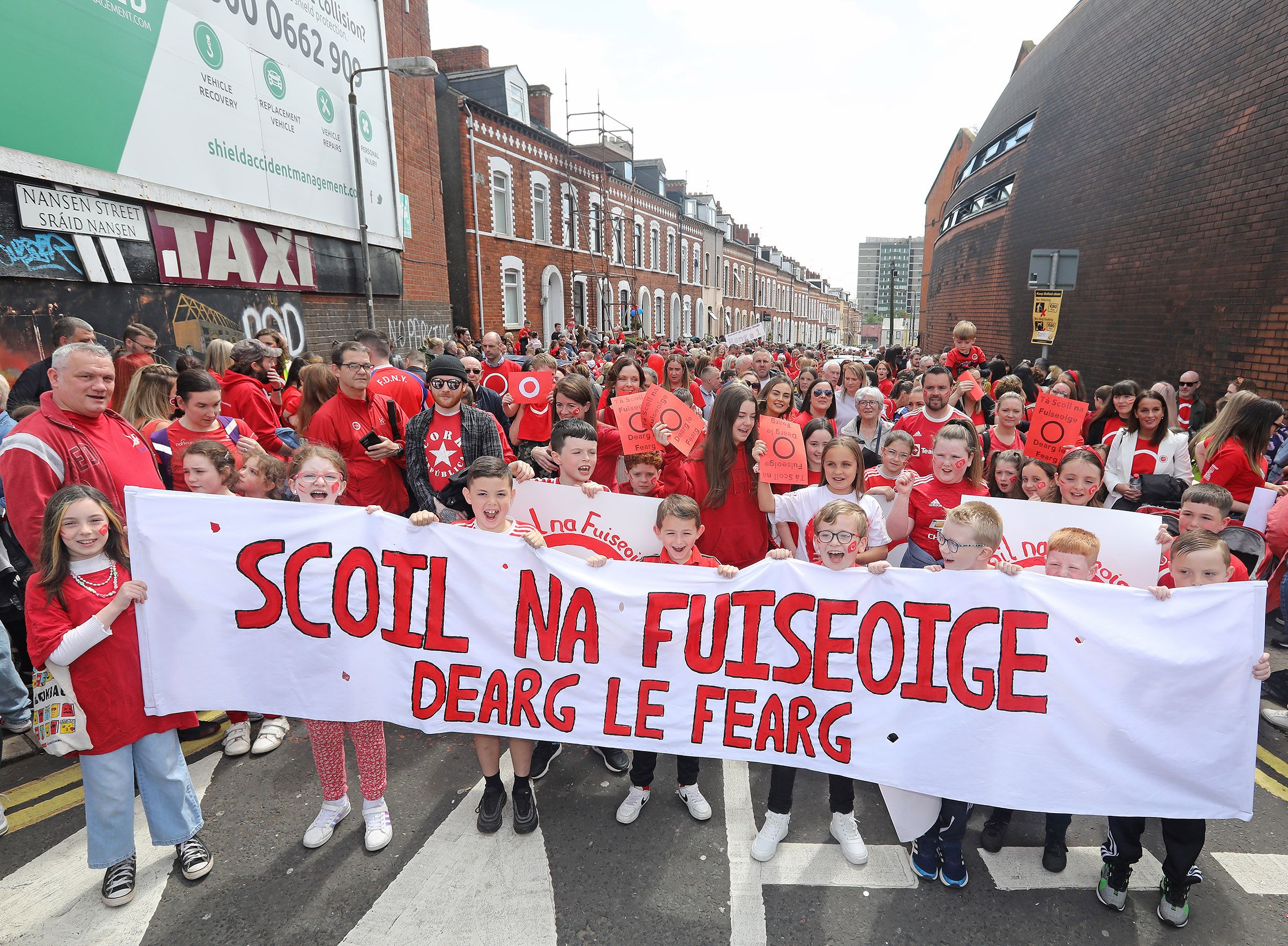 Irish speaking families, community groups, GAA teams, sports clubs and others joined together in a colourful and vibrant march from Cultúrlann McAdam Ó Fiaich to Belfast City Hall, where speakers and singers called for equality and recognition for the Irish language.