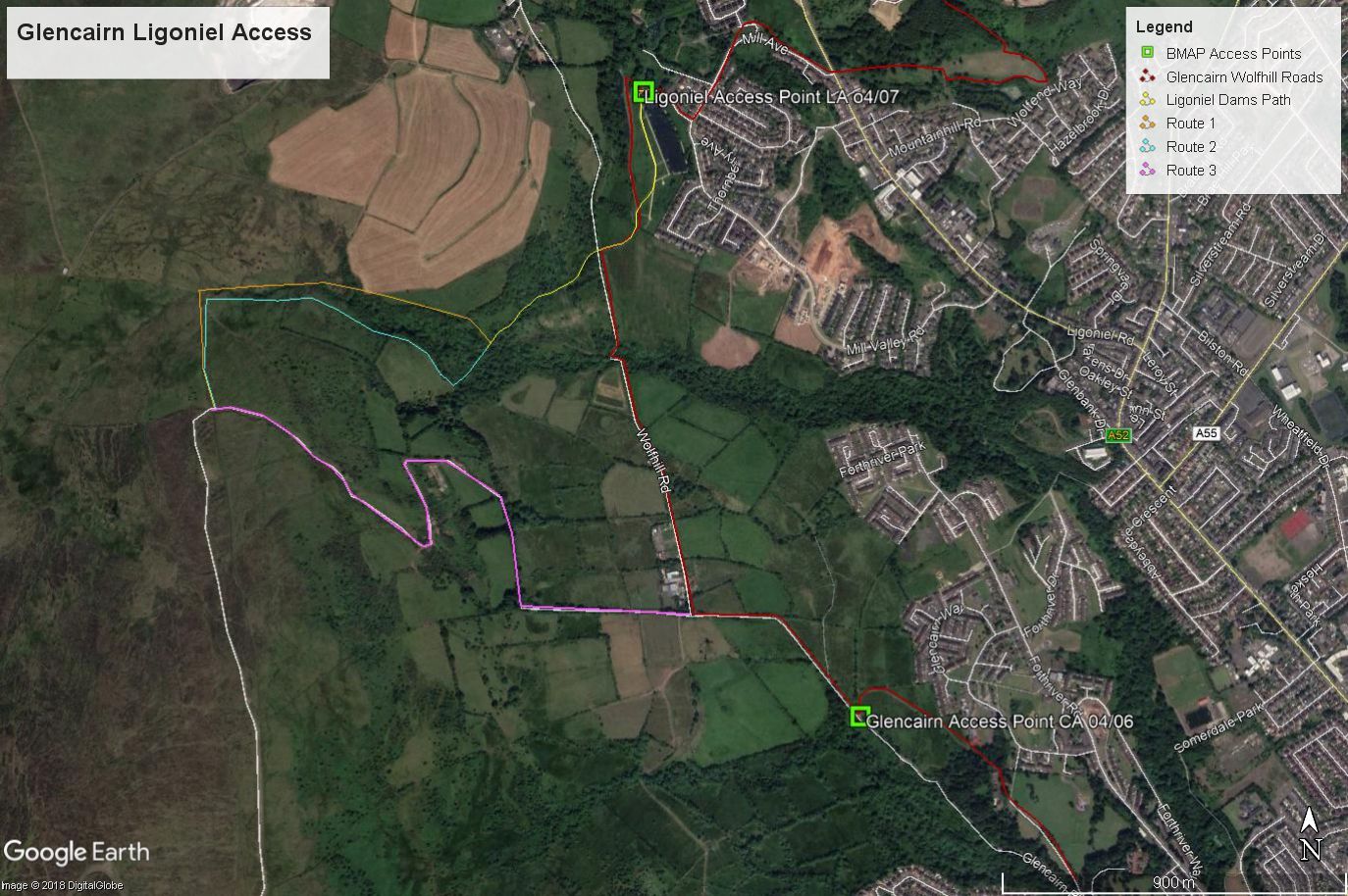 This route would provide the most direct access to the hills from Ligoniel, and a less roundabout route for those hoping to complete a full Belfast Hills Walk. It would provide equally good access from Glencairn via Wolfhill Road and the mill race path. Walkers from Glencairn would not have to go into Ligoniel.