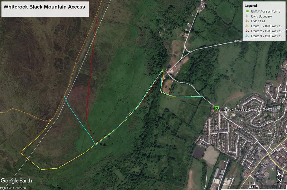 The first route in this proposal has historically been seen as an assumed right of way by the local community. It runs from the top of the Whiterock Road, follows an obvious oblique line up the hillside to the Black Mountain. This is the preferred route though complexities of land ownership may cause problems.