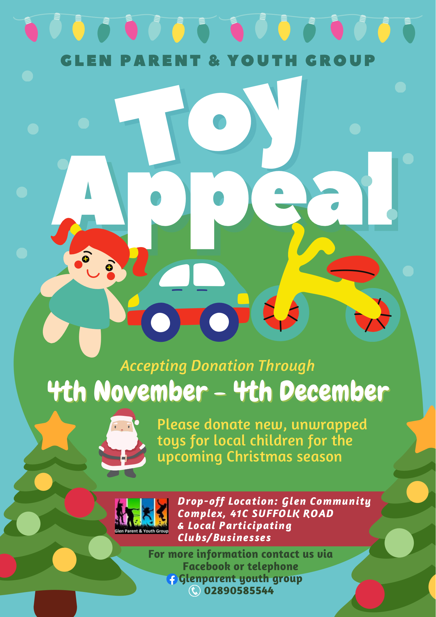 Each of the organisations are organising a ‘Drop Off Day’ where their members and families can leave toys, vouchers or donations. These will then be brought to the Glen Community Complex for distribution. Only new or wrapped toys can be accepted and they are also looking vouchers for teenagers.