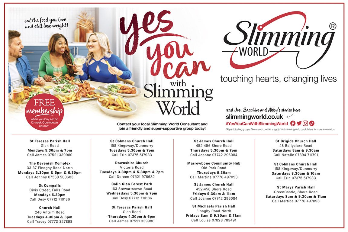The St Teresa’s Slimming World group is held every Monday @ 5.30pm & 7pm and every Thursday at 4.30pm & 6pm in the Parish hall, Glen Road.