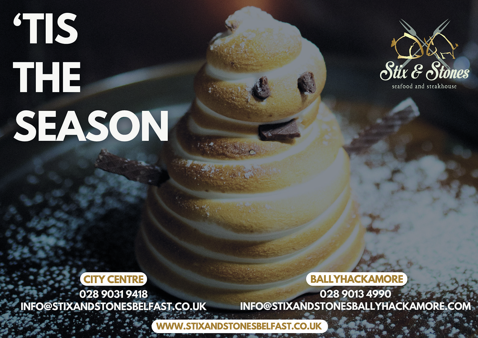 Offering our exquisite Christmas Menu, crafted by our chefs with a selection of mouth-watering dishes, from delectable seafood to succulent steaks there’s something to tantalise every palate. We’ve kept our most popular Christmas dishes and added some new exciting flavours to the mix. Gather your nearest and dearest and celebrate in style with us! Book a table for Stix & Stones City Centre or Stix & Stones Ballyhackamore at: www.stixandstonesbelfast.co.uk