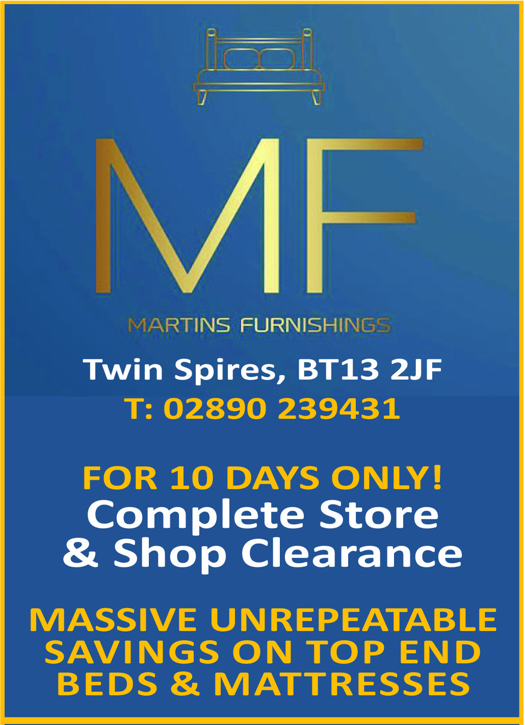 GET ready for a complete store and shop clearance at Martin’s Furnishings, based at Twin Spires Complex.