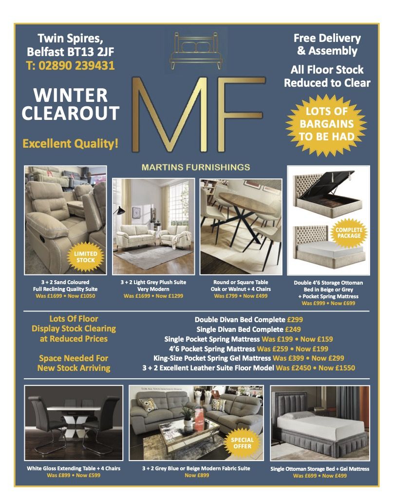 GET ready for a complete floor stock clearance at Martin’s Furnishings, based at Twin Spires Complex on the Falls Road.
