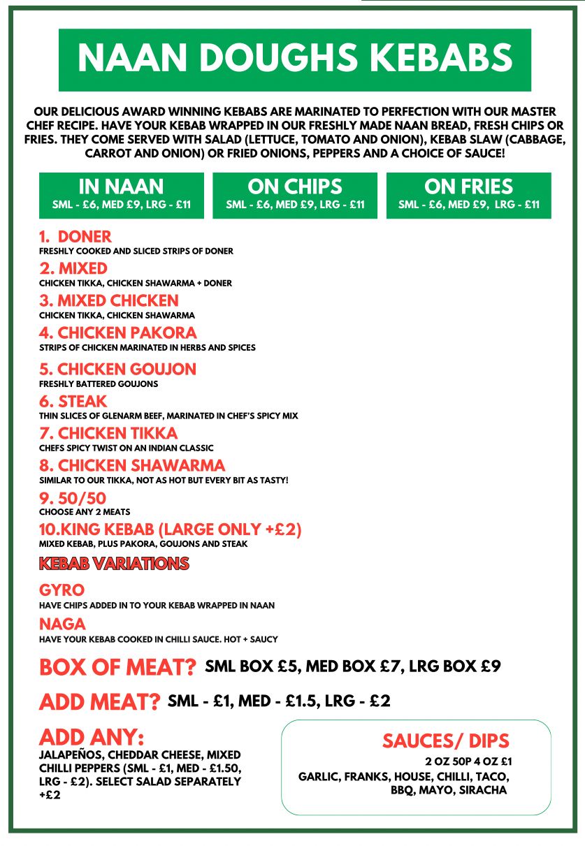 Naan Doughs offer ten different type of kebabs, including Doner, Steak, Chicken Pakora, Mixed, Chicken Tikka and Chicken Shawarma. Marinated to perfection with their own masterchef recipe, the kebabs can be served in naan and put through a unique conveyer belt oven for maximum taste and experience. They are also available on chips or on fries.