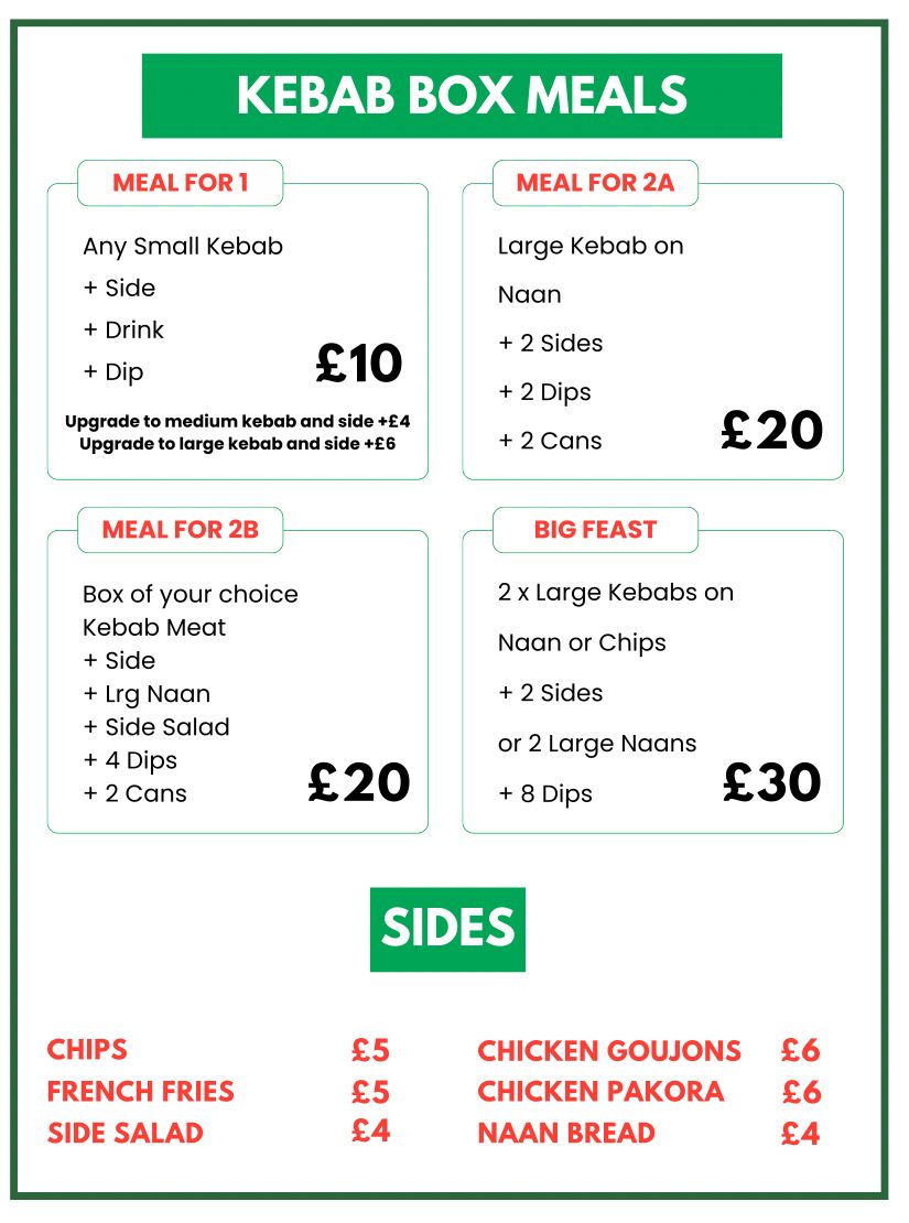 They come with salad (lettuce, tomato and onion), kebab slaw (cabbage, carrot and onion) or fried onions, peppers and a choice of sauce. They also offer a range of fantastic value meal deals for one, two and the family.
