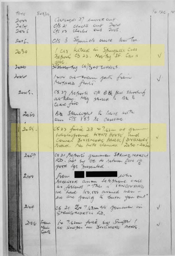 Following a targeted request for information and a Public Interest Test, Paper Trail secured new evidence from Watchkeeper and Radio Logs of the British Army’s King’s Regiment. Among new information was a report: “c/s 22 [Call Sign 22] fired 23 x 7.62mm at gunman waste ground WHITE HOUSE and corner DIVISMORE PARK/DIVISMORE ROAD. No hits claimed 2030 – 2050”.