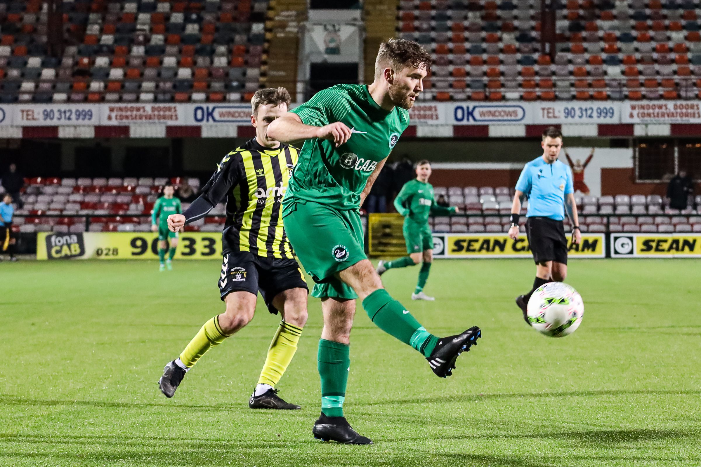 The winger’s first touch and close control allowed him to ghost past Cummings before whipping in a beautiful inviting cross onto the onrushing forehead of Matthew Ferguson. The striker just managed to get a glancing touch on it, as goalkeeper Marc Maybin could only watch on as it fizzed past the far post.