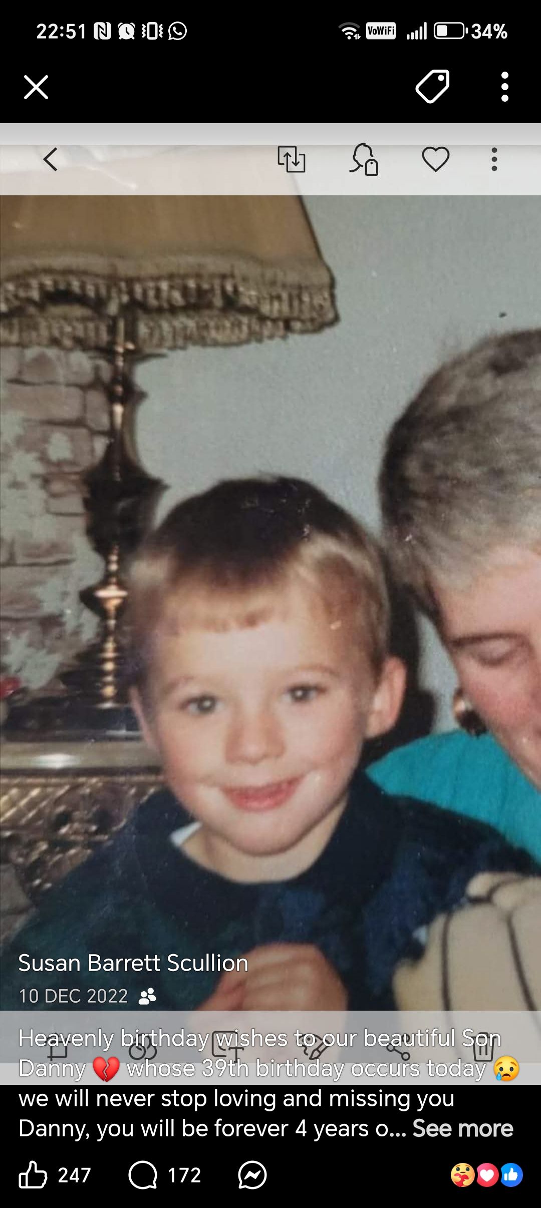 Scullion Sending birthday wishes to my wee nephew Danny whose 42nd birthday occurs 10th December. Just as you were Danny, you will always be, someone very special in my memories. From uncle Con.