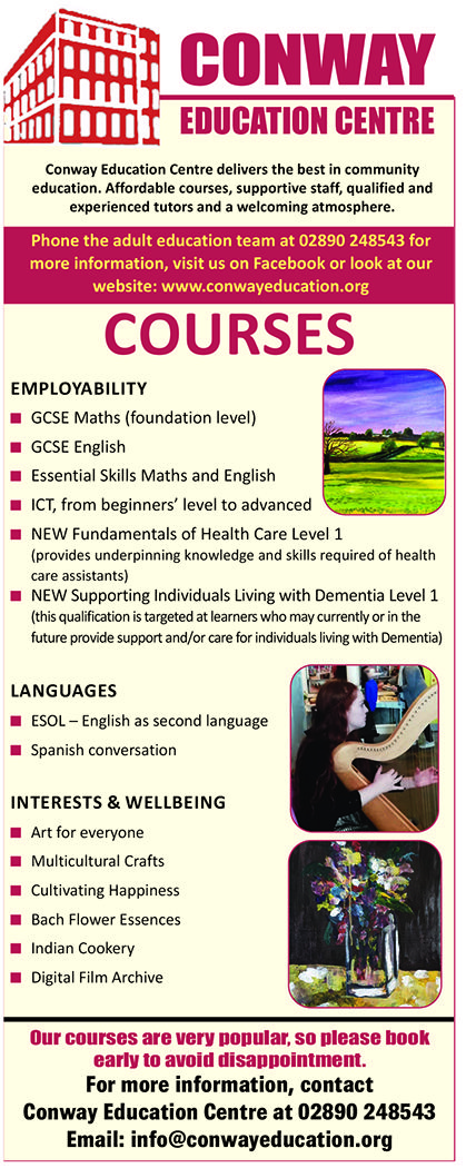 SEPTEMBER is only a few weeks away, time to think about doing something for yourself, perhaps learning a new skill and meeting friends you haven’t met yet? Conway Education Centre could just be the place for you. Education is like an investment in yourself, it benefits you in so many ways and nobody can take it away!