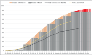 The highest figure for deaths is shown by the grey columns. These are the registered deaths from all causes that are over and above the expected number of deaths at this time of year – based on the average for the last five years. As of 15th May the total excess deaths (867) were almost twice the number reported by DoH as confirmed Covid-19 deaths (469).