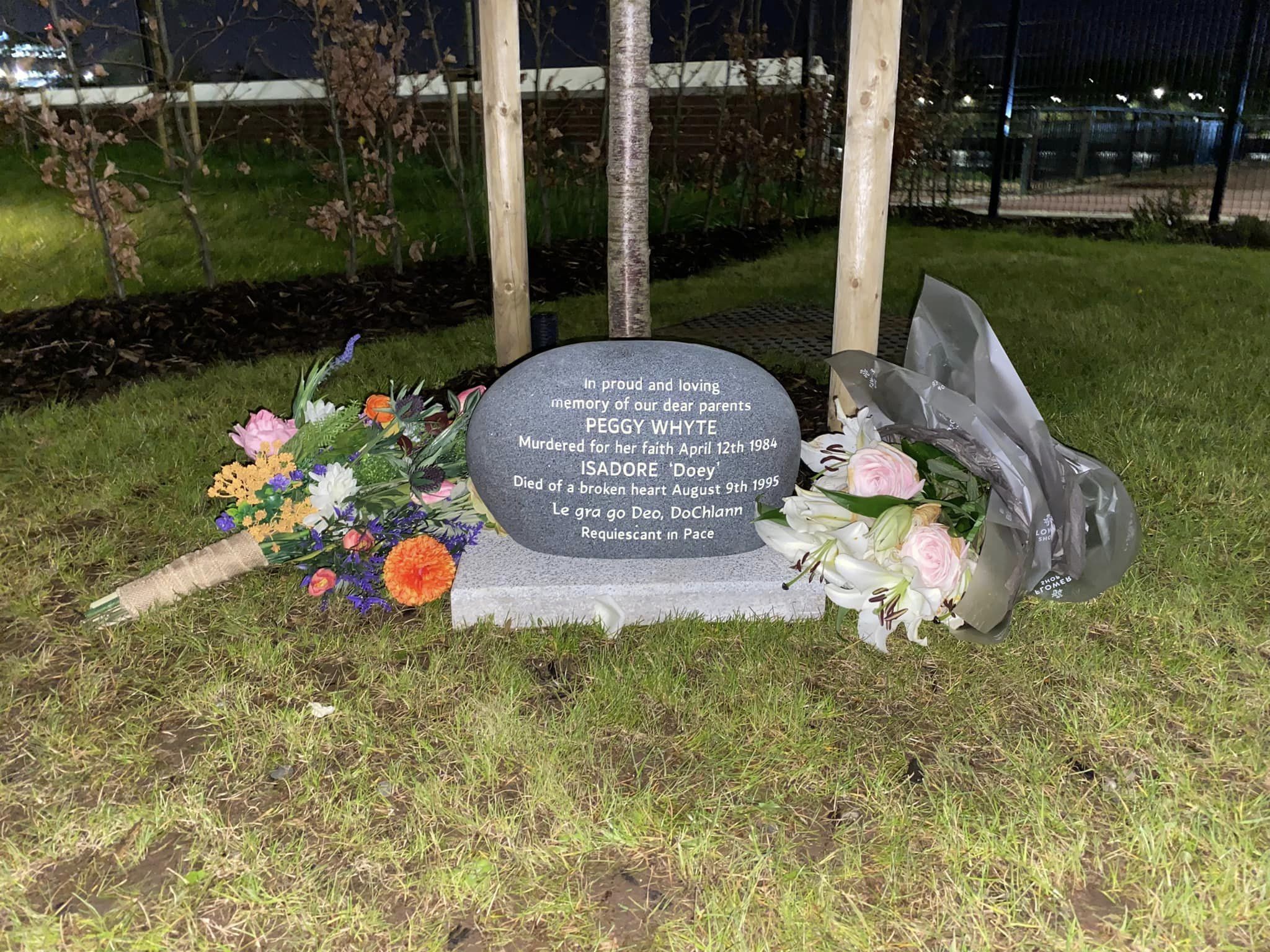 The stone, which also carries the name of her late husband Isadore ‘Doey’ Whyte, is located in a new community garden on the River Lagan beside Shaftesbury Leisure Centre. Around 350 people gathered for the event, including relatives of those killed in the May 1974 UVF bomb attack on the nearby Rose and Crown bar, which claimed the lives of six people.