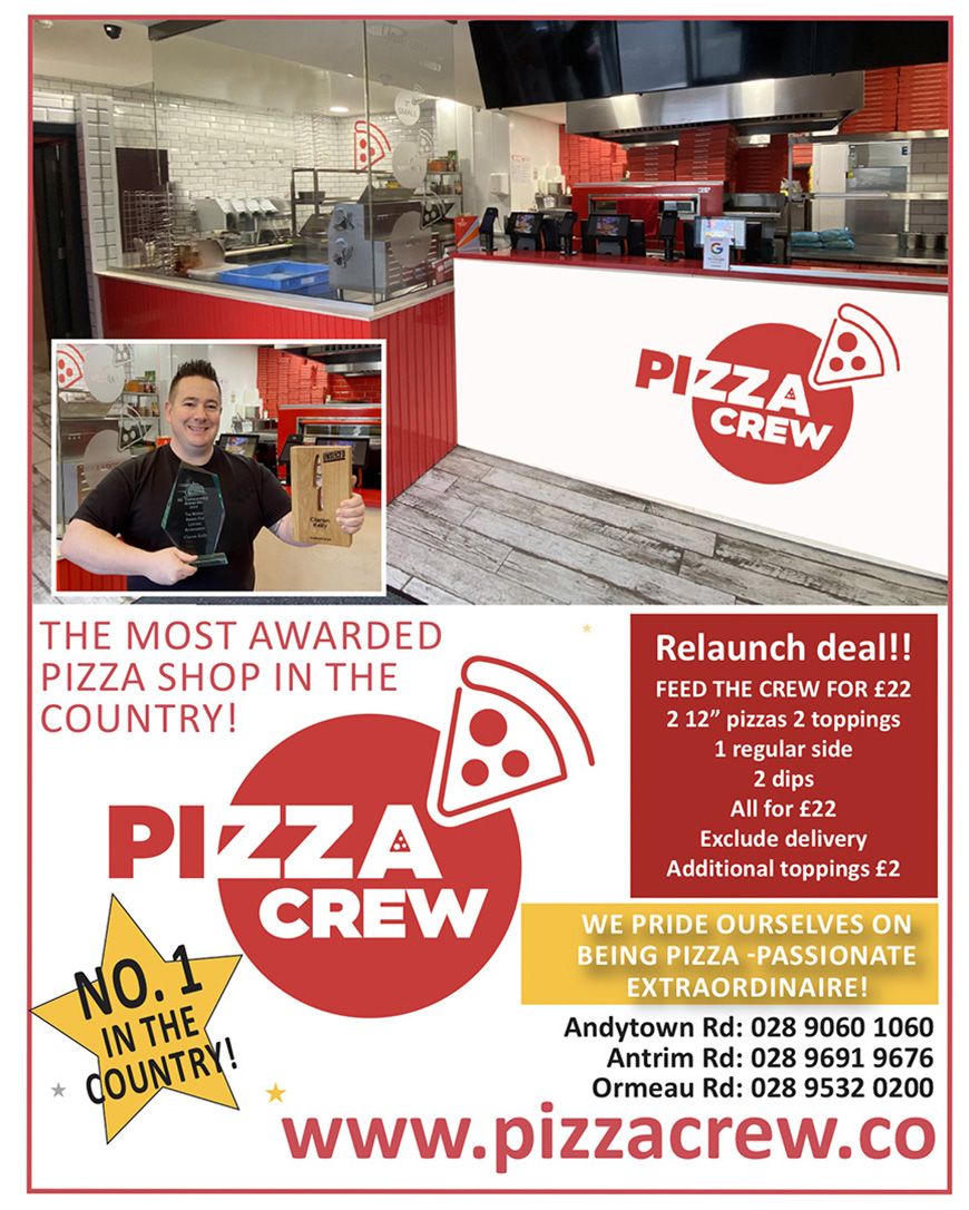 They also have a RELAUNCH DEAL – 'Feed the Crew' for £22 – two 12"pizzas, two toppings, one regular side and two dips - all for £22. (Exclude delivery, Additional toppings £2) Visit www.pizzacrew.co to order or download the Pizza Crew app. Call the Andersonstown Road store on 02890 601060, the Antrim Road store on 02896 919676 and the Ormeau Road store on 02895 320200.