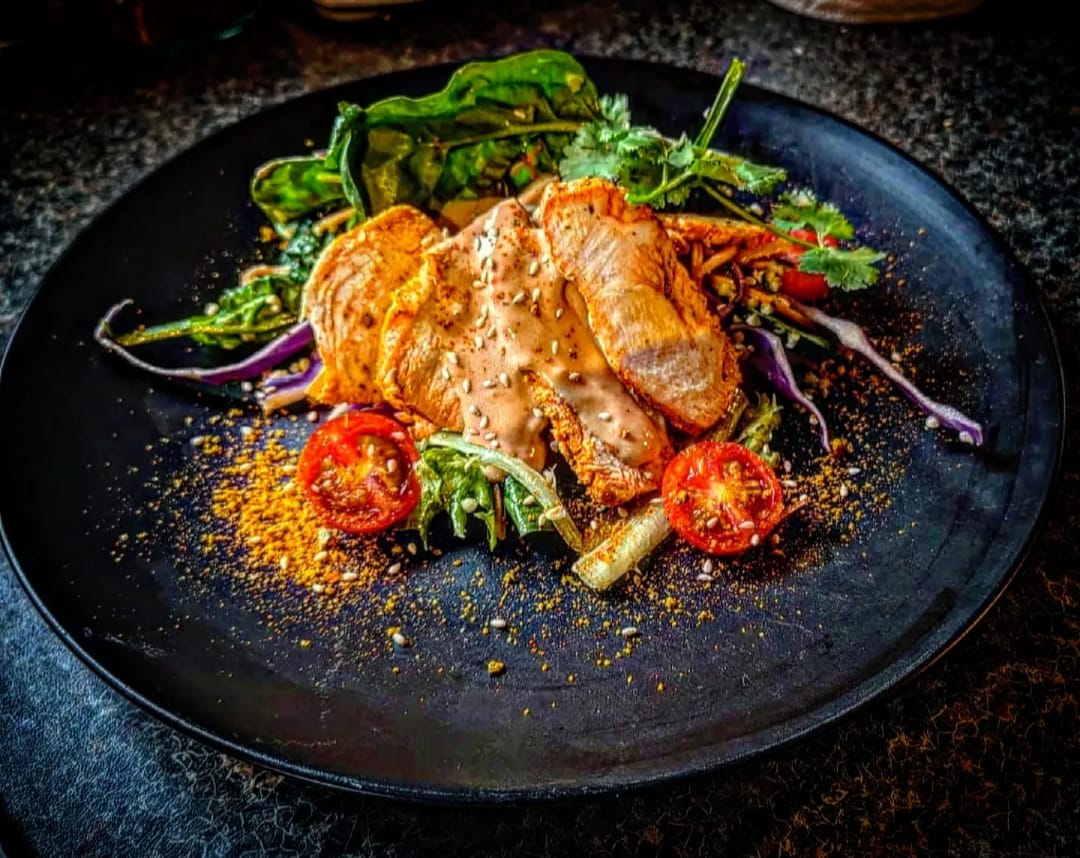 Gather two large plates and place the salad in the centre of the plate. Place tomato clockwise around the plate. Slice the chicken finely and place on the salad. Remove the dressing from the refrigerator and spoon over the top of the chicken. Sprinkle some of the sesame seeds over the dressing and sprinkle a little shawarma spice around the plate and garnish with the corriander.