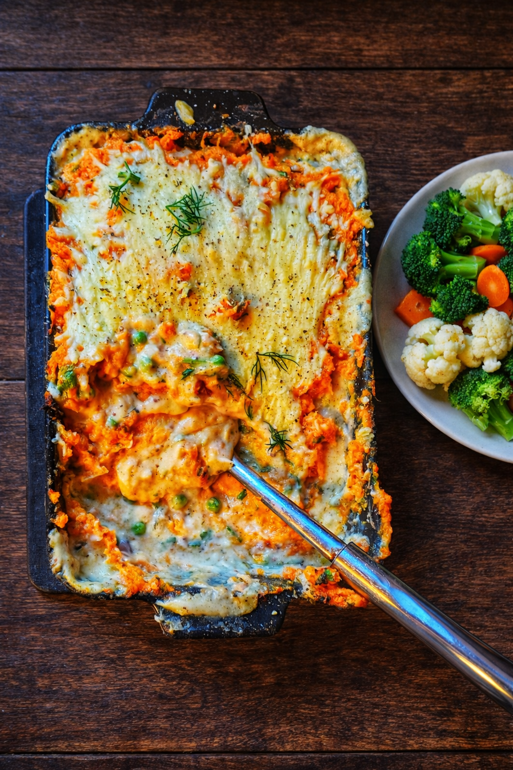 Serve the fish pie hot with the steamed vegetables on the side.