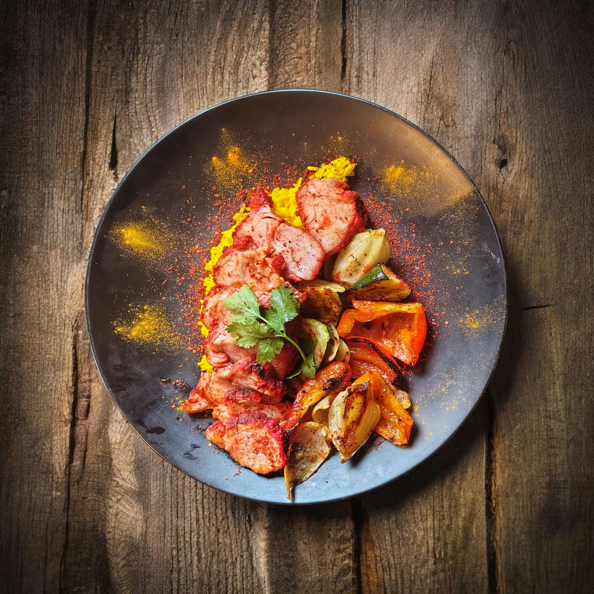 Carefully remove the pork from the oven and place it on a board for a few minutes allowing it to rest. You are now ready to plate up. I used a black plate for an added touch, but this will equally look good on either colour plate. Place rice down on one side of the plate and spread it out evenly. Take veggies and place them on the other side of the plate; carefully slice the pork and place it on top of the rice. Add a picked coriander leaf on top. Sprinkle spices around the plate and serve and enjoy.