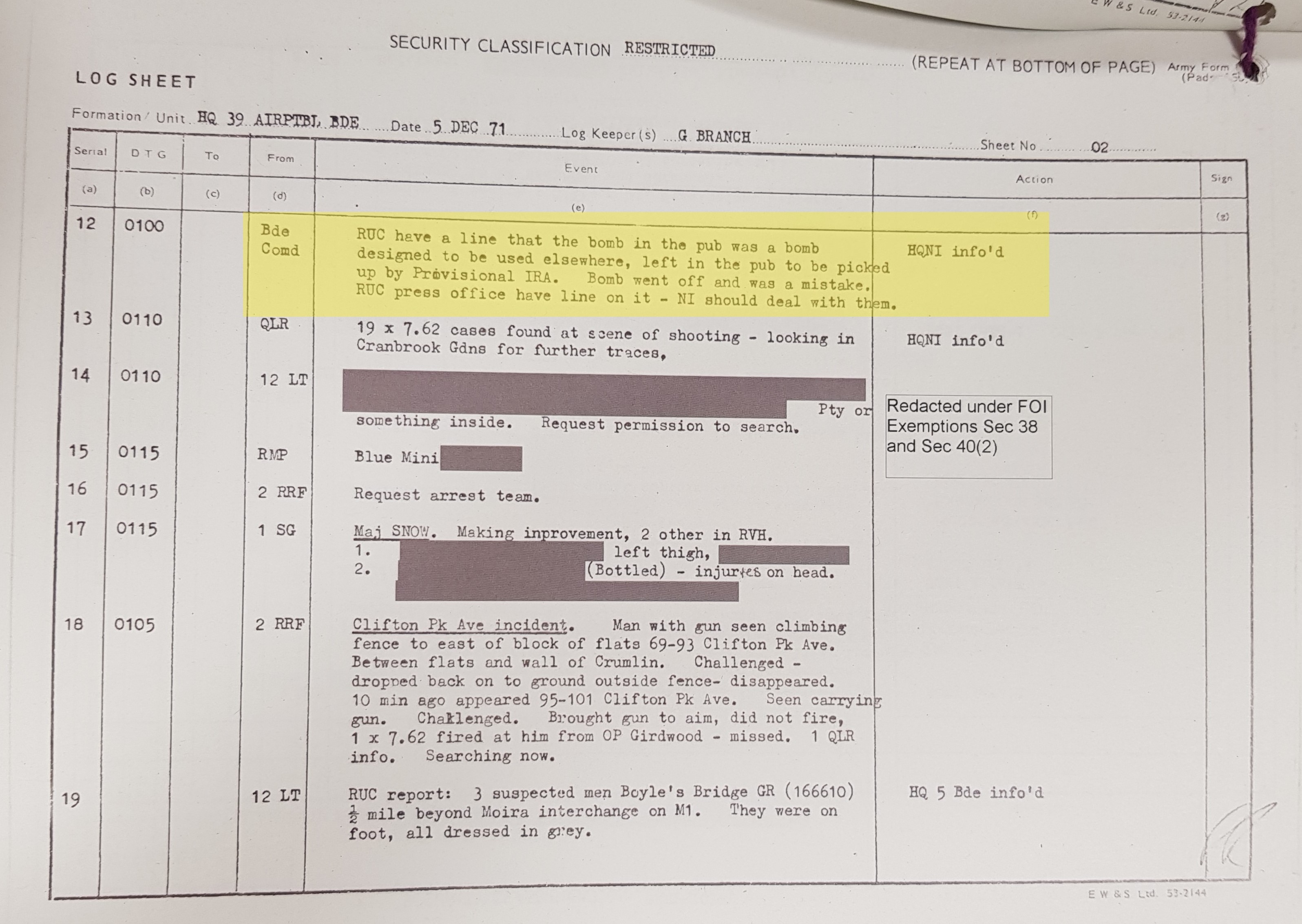 A log in the Commander’s Diary for 39 Brigade proved that Brigade Commander Kitson informed Brigade staff at 1am on December 5 1971, just over four hours after the bombing: "RUC have a line that the bomb in the pub was a bomb designed to be used elsewhere, left in the pub to be picked up by the Provisional IRA. Bomb went off and was a mistake. RUC press office have a line on it – NI should deal with them."