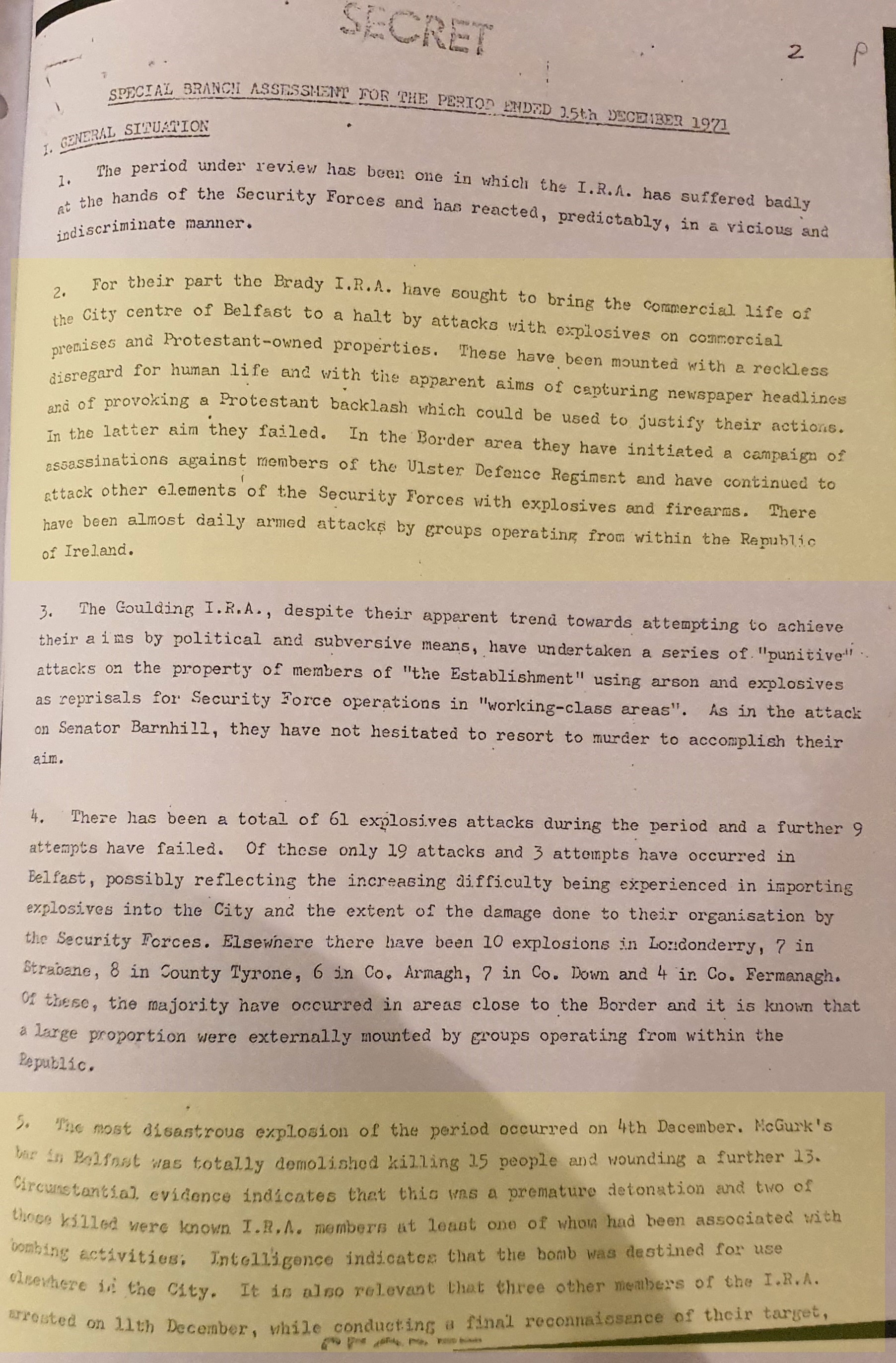 It stated: "Circumstantial evidence indicates that this was a premature detonation and two of those killed were known IRA members at least one of whom had been associated with bombing activities. Intelligence indicates that the bomb was destined for use elsewhere in the city."