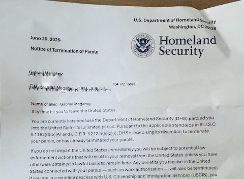 The letter, which is headed "Notice of Termination of Parole," warns Megahey to "not attempt to unlawfully remain in the United States - the federal government will find you. Please depart the United States immediately."