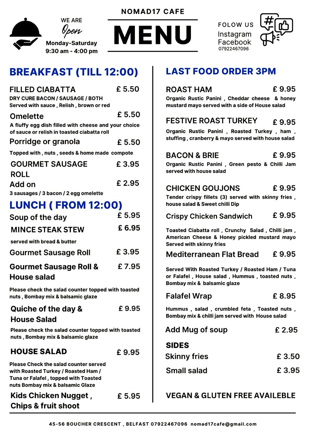 Currently having seating for up to 80 diners, Nomad 17 opens from 10am-4pm Monday to Saturday, serving artisan tea and coffee, freshly made sandwiches, wraps and baguettes, soup of the day, a full salad bar and a selection of tasty traybakes and treats.