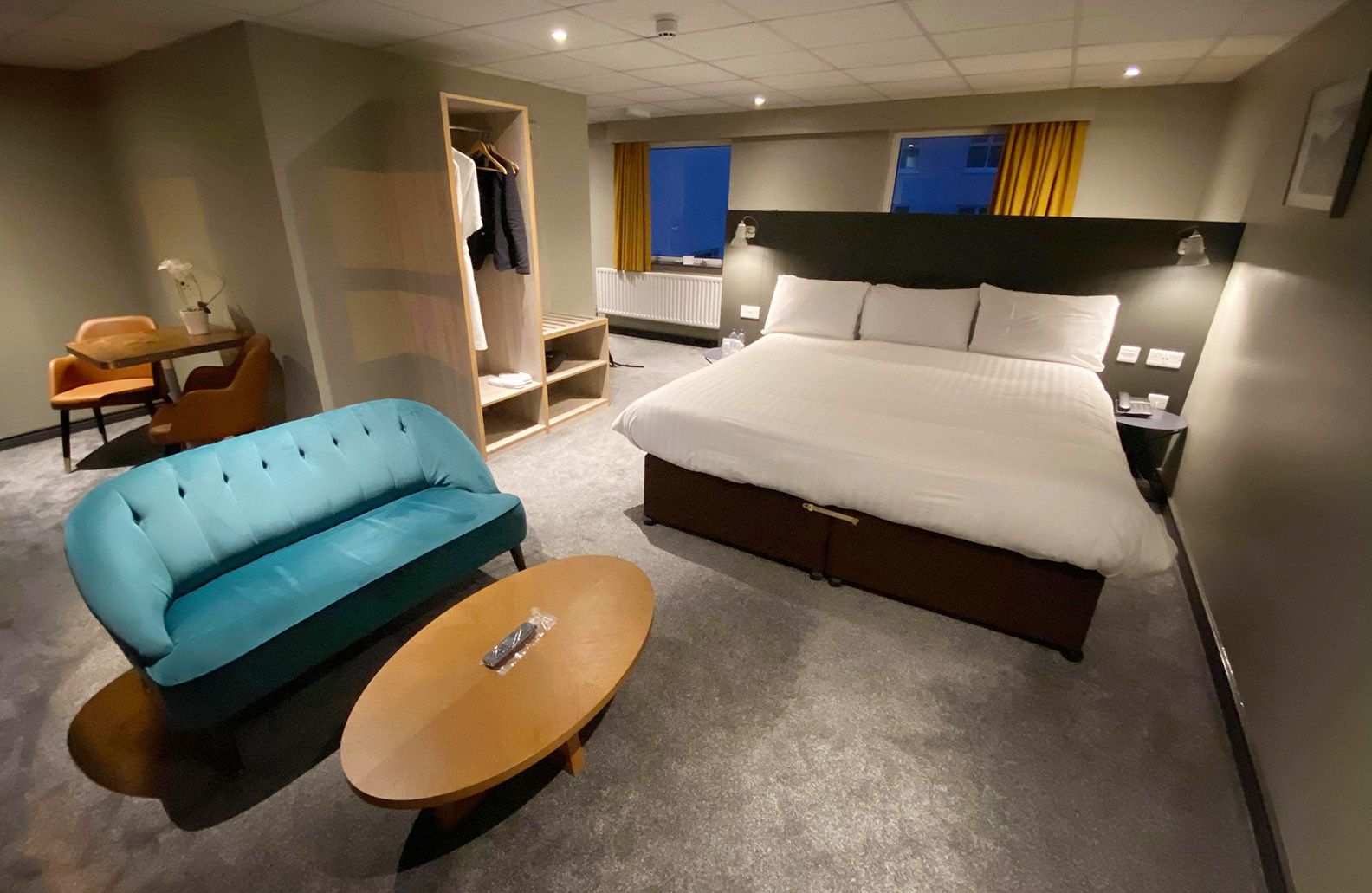 The grey and mustard décor gave a modern feel and matched with the industrial black metalware in the bathroom, the room was spacious, chic and comfortable. The huge bed faced out to the sea and I watched the last of the daylight with a coffee while Lady Lensman made use of the dressing area and full-length mirror to get ready for dinner.