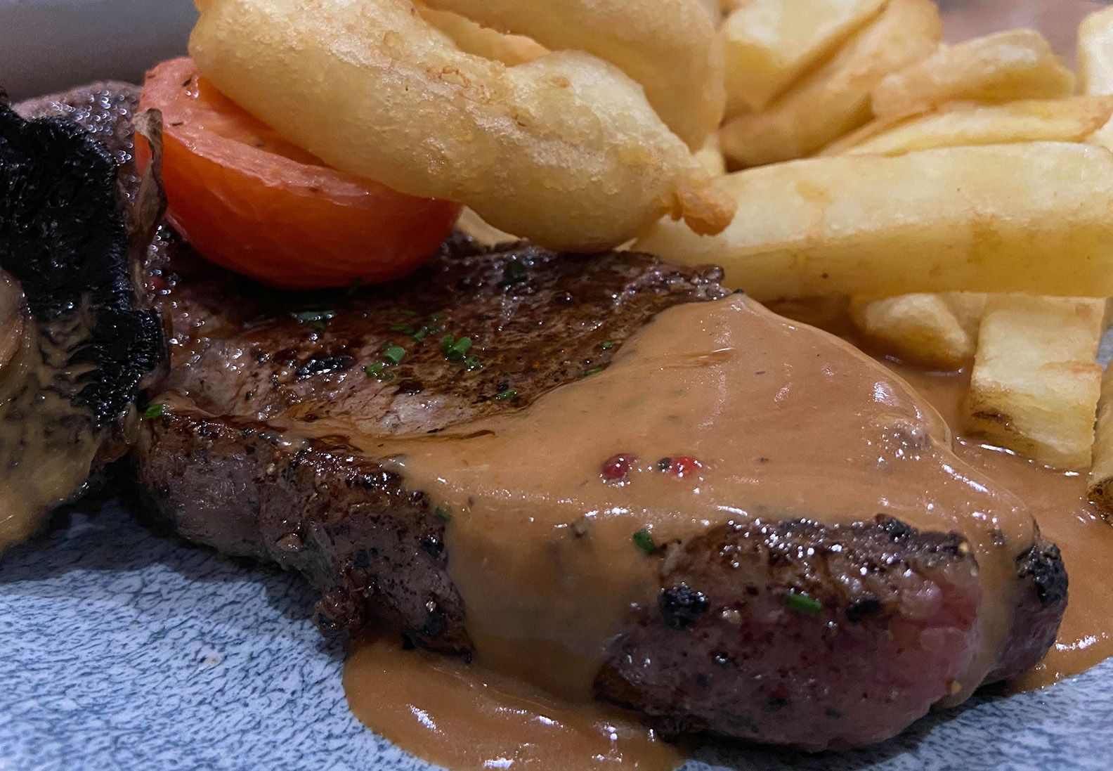 For main I ordered the 10oz sirloin steak, which was served with chunky chips, onion rings and roasted tomato and mushroom topped with pink peppercorn sauce. The entire dish was delicious, the steak was tender and cooked to perfection and the pink peppercorn sauce topped it off perfectly. Lady Lensman had the grilled seabass with pak choi and egg noodles with orange and chilli dressing. The fish was also perfectly cooked and the dressing was a well-balanced accompaniment without overpowering the seabass.