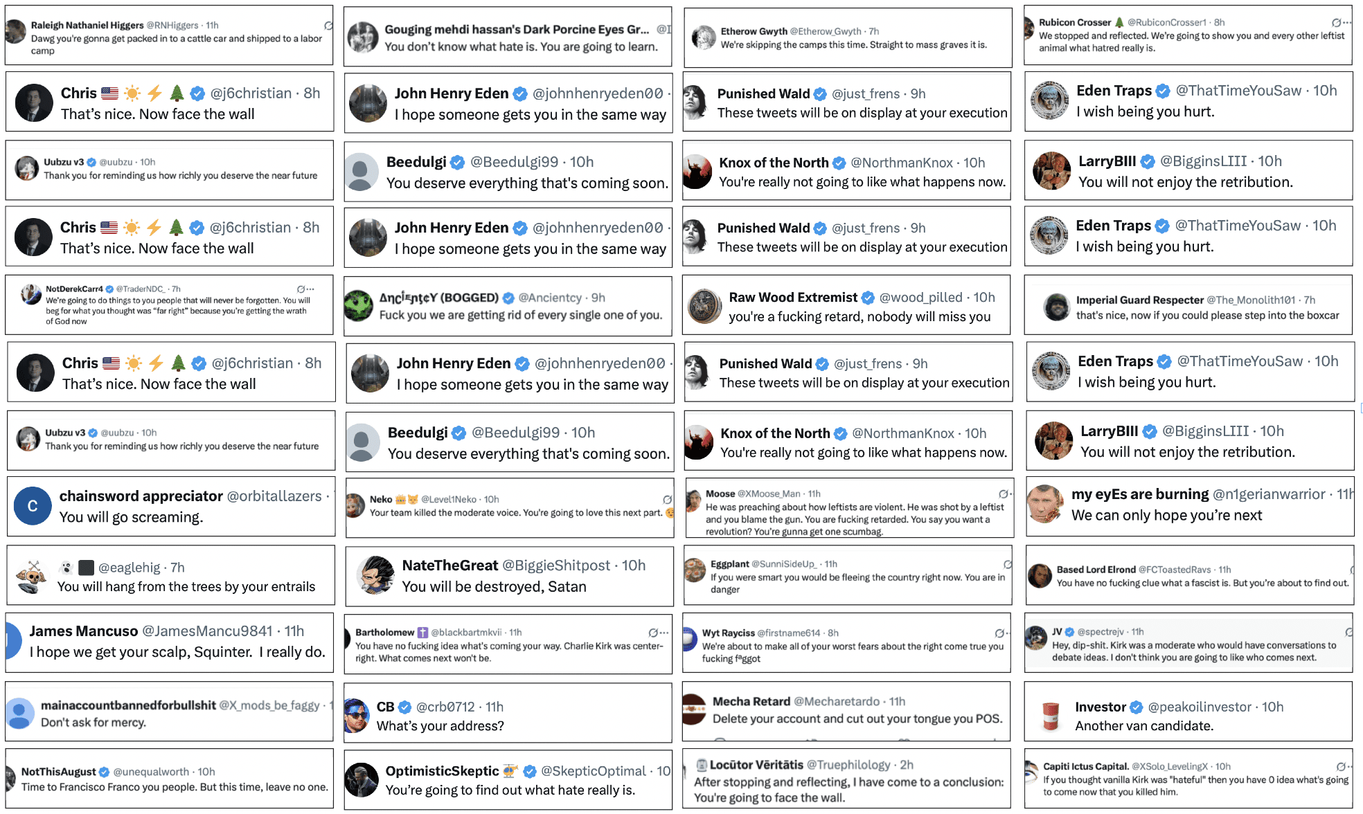 Now Squinter’s not exactly unused to death threats. He’s had his sympathy-card warnings, his bullets in the post and his address and car registration bandied around, and while it’s not exactly a barrel of laughs, there was a time when it kind of went with the territory. But waking up to learn that you’ve received ten times more death threats in eight hours than you have in your entire life is not something that even a lifetime of incurring the displeasure of Loyal Ulster can prepare you for. No point in going through them all, so the image along with this piece is a representative selection to give you a flavour of how Squinter’s suggestion that Charlie Kirk might not be Mother Teresa went down on US Twitter.