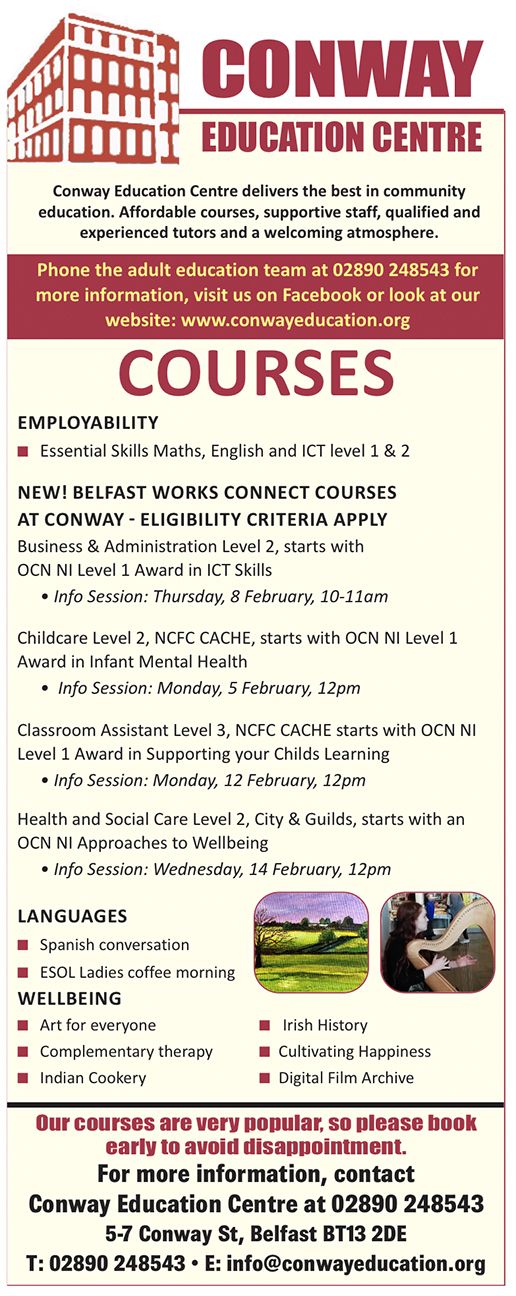 Our courses are designed to meet the needs of adult learners. This is reflected in the supportive teaching style, affordable course fees and payment plans, mentor system and welcoming environment, all located on your doorstep, on the second floor in Conway Mill, just off the Falls Road.