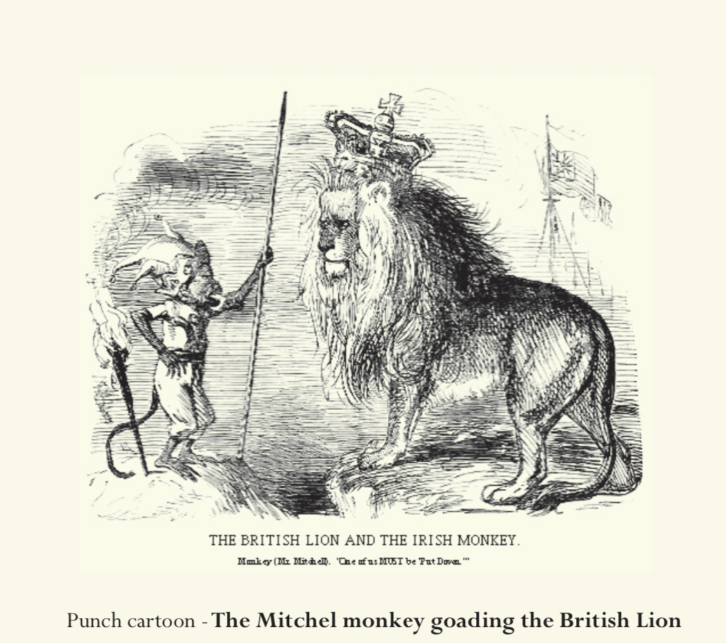 In May 1848, responding to such writing, Dublin simmered, angry and ready for rebellion. Fearful of Mitchel’s power, London’s Punch magazine emphasized Mitchel’s international standing by portraying him as an Irish Monkey challenging the Great British Empire. The Times thundered against him. When John Mitchel produced his own republican newspaper, the United Irishman, it sold out. In order to silence Mitchel, to rob him of his heroic status, his possible martyrdom, the British Government passed the 1848 Treason Felony Act, which sought to treat treason as a common crime. Mitchel was arrested, tried and transported.